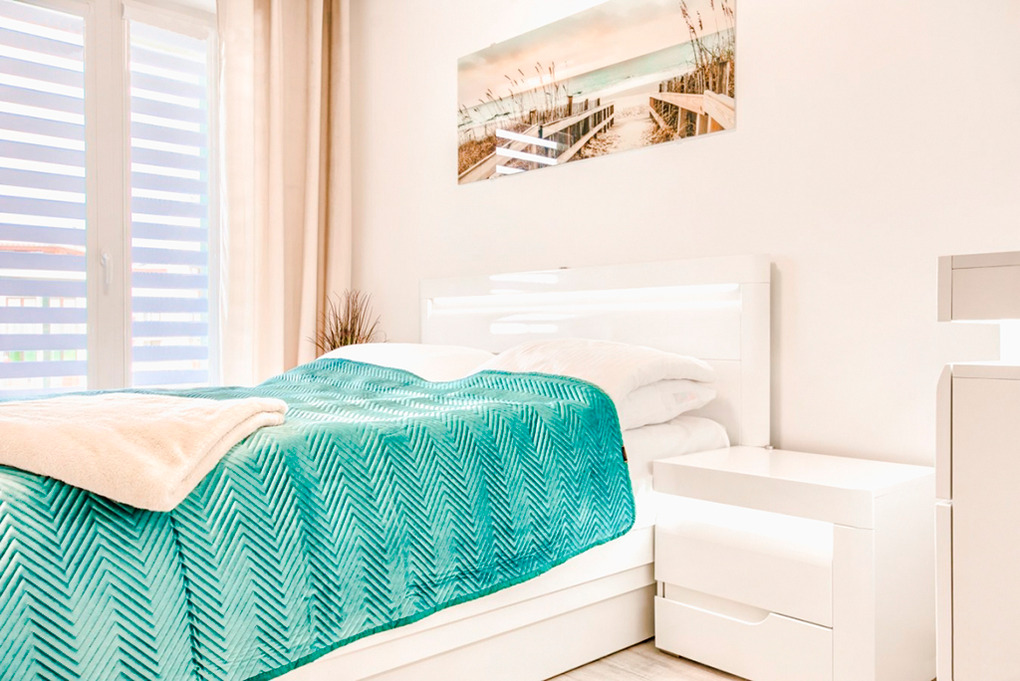 PL 40.40B Wohnung 2-4 Pers.: Komfortable 2-Zimmerwohnung mit 38 qm Wohnfläche, 4. Etage (Aufzug). Wohn-/Essraum mit Couchgarnitur (Ausziehsofa 2 Pers.), bodentiefe Fenster, Flachbild SMART-TV, Internet (WLAN), Esstisch, moderner Küchenzeile (2 E-Platten Ceran, Backofen, Mikrowelle, Spülmaschine). Doppelzimmer. Bad: Du, Wb, WC, Waschmaschine. Balkon mit Sitzmöbeln.