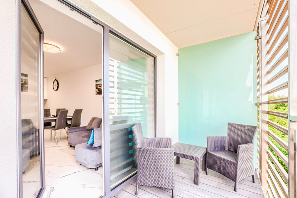 PL 40.40 Wohnung 2-4 Pers.: Geschmackvoll eingerichtete 2-Zimmerwohnung mit 40 qm Wohnfläche, 2. Etage (Aufzug). Wohn-/Essraum mit Couchgarnitur (Ausziehsofa 2 Pers.), bodentiefe Fenster, Flachbild SMART-TV, Internet (WLAN), Esstisch, moderner Küchenzeile (2 E-Platten Ceran, Mikrowelle, Spülmaschine). Doppelzimmer mit TV. Bad: Du, Wb, WC, Waschmaschine. Balkon mit Sitzmöbeln.