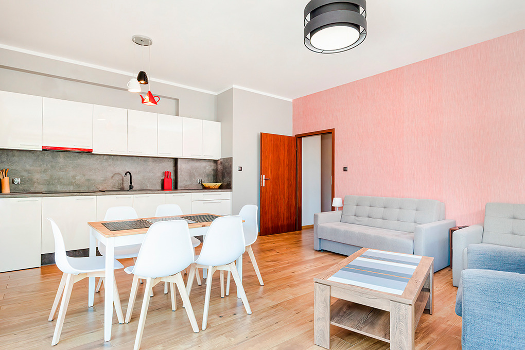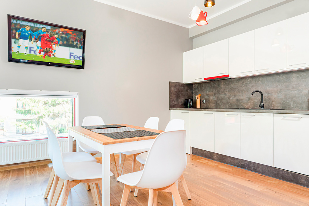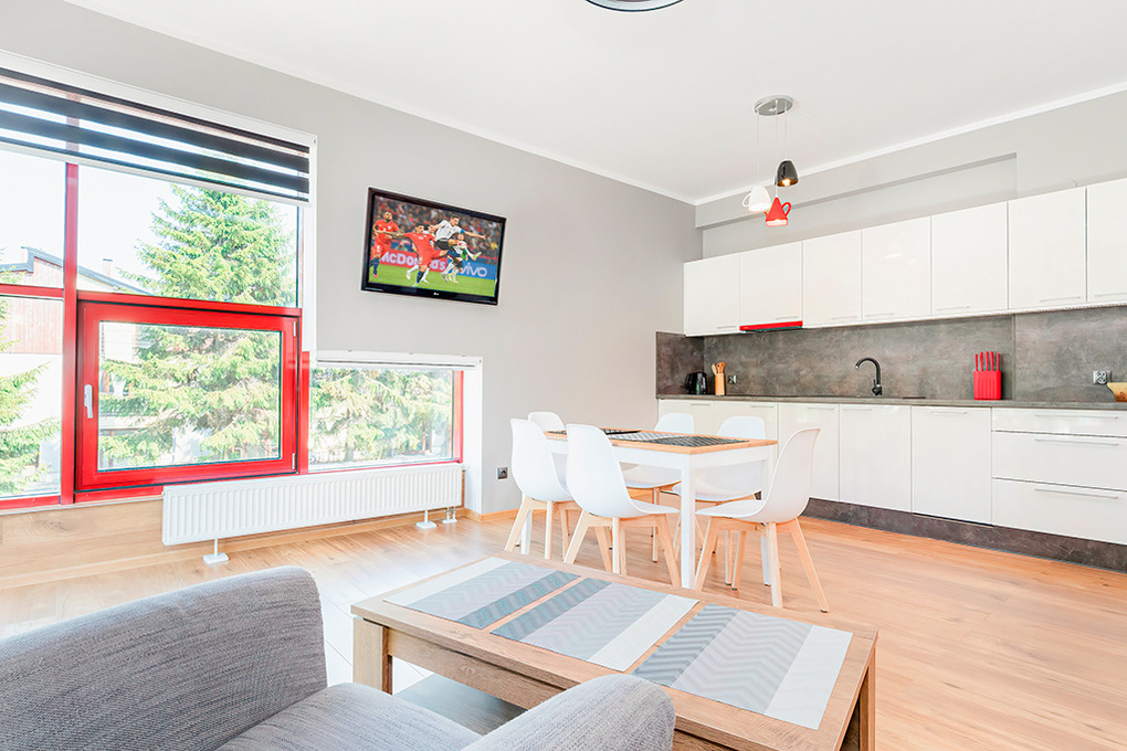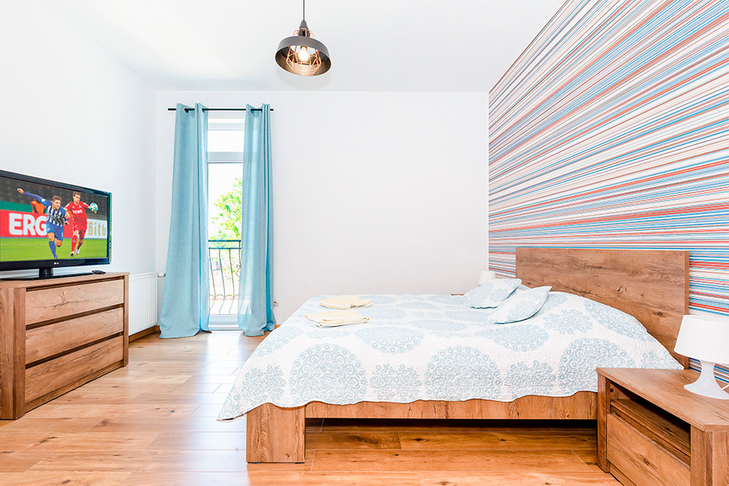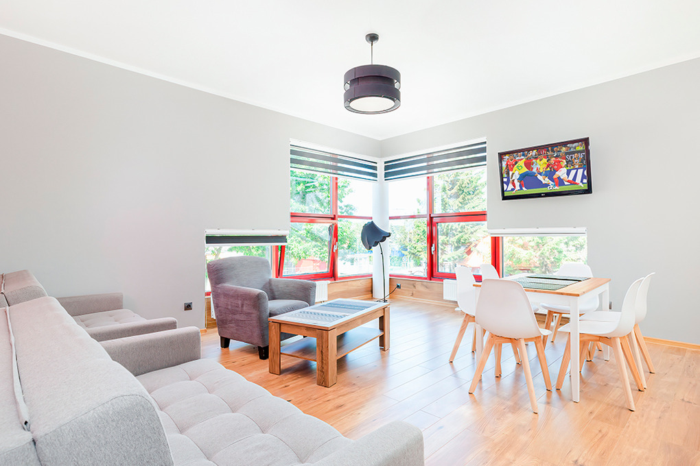 PL 41.10 Wohnung 2-4 Pers.: Niveauvoll eingerichtete 2-Zimmerwohnung mit 50 qm Wohnfläche, 1. Etage. Schöner, heller Wohn-/Essraum mit großen, bodentiefen Fenstern, 2 Sofas (jeweils Schlafcouch à 2 Pers.), Flachbild Sat-TV, Esstisch, Küchenzeile (4 Induktionsplatten, Abzugshaube, Spülmaschine). Doppelzimmer mit Flachbild Sat-TV. Großes Bad: Dusche, Eckbadewanne, Wb, WC. Hinweis: Die max. Belegung der Ferienwohnung darf 4 Pers. nicht überschreiten.