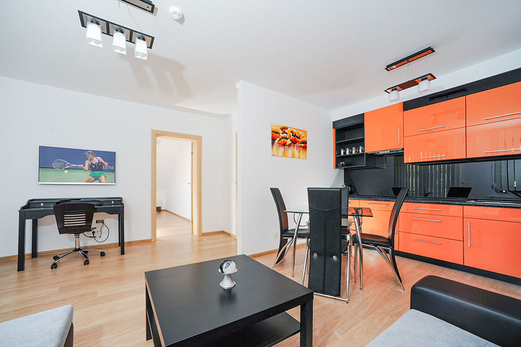 PL 41.12 Wohnung 1-4 Pers.: Niveauvoll eingerichtete 2-Zimmerwohnung mit 45 qm Wohnfläche, 1. Etage. Schöner Wohn-/Essraum mit Sitzgarnitur (Schlafsofa 2 Pers.), Sat-TV, Esstisch, Küchenzeile (2 Pl.-Ceranfeld, Mikrowelle). Doppelzimmer. Bad/WC. Balkon mit Sitzmöbeln.