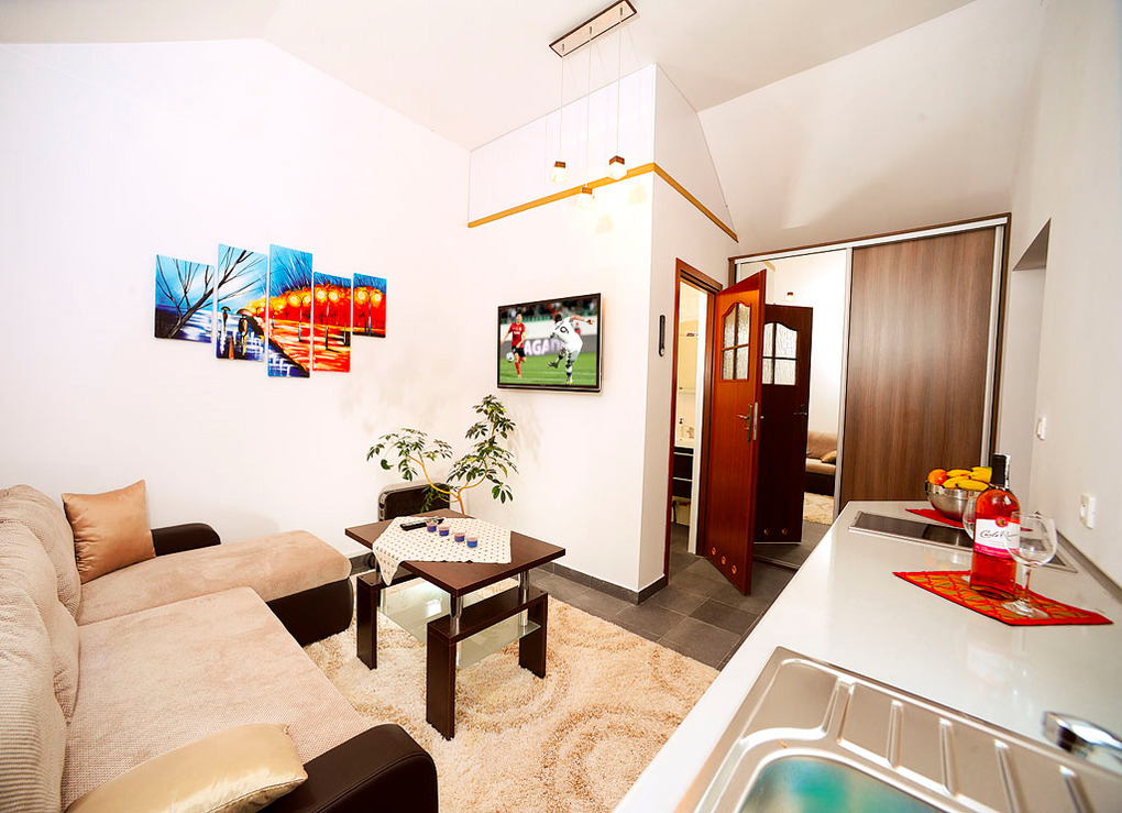 PL 41.14 Ferienhaus 2 Pers.: Schönes 1-Raumhaus mit ca. 15 qm Wohnfläche. Wohnraum mit Ausziehsofa (2 Pers.), Couchtisch, Flachbild-Sat-TV, Radio/CD-Player, Küchenzeile. Bad/WC.