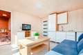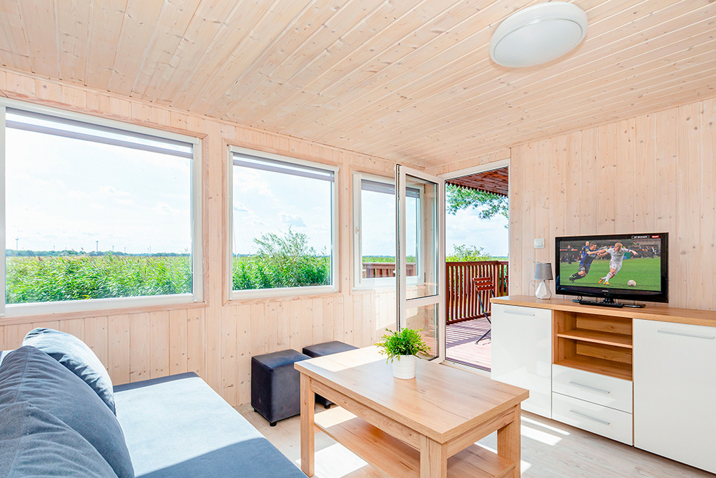 PL 43.15 Ferienhaus 2-4 Pers.: 3-Zimmerhaus mit 37 qm Wohnfläche. Wohn-/Essraum mit Sofa, Flachbild SAT-TV mit deutschen Programmen, Couchtisch, Küchenzeile (2 E-Platten). 2 Doppelzimmer. Bad/ WC. Teilweise überdachte Terrasse mit Sitzmöbeln, Wasserblick.