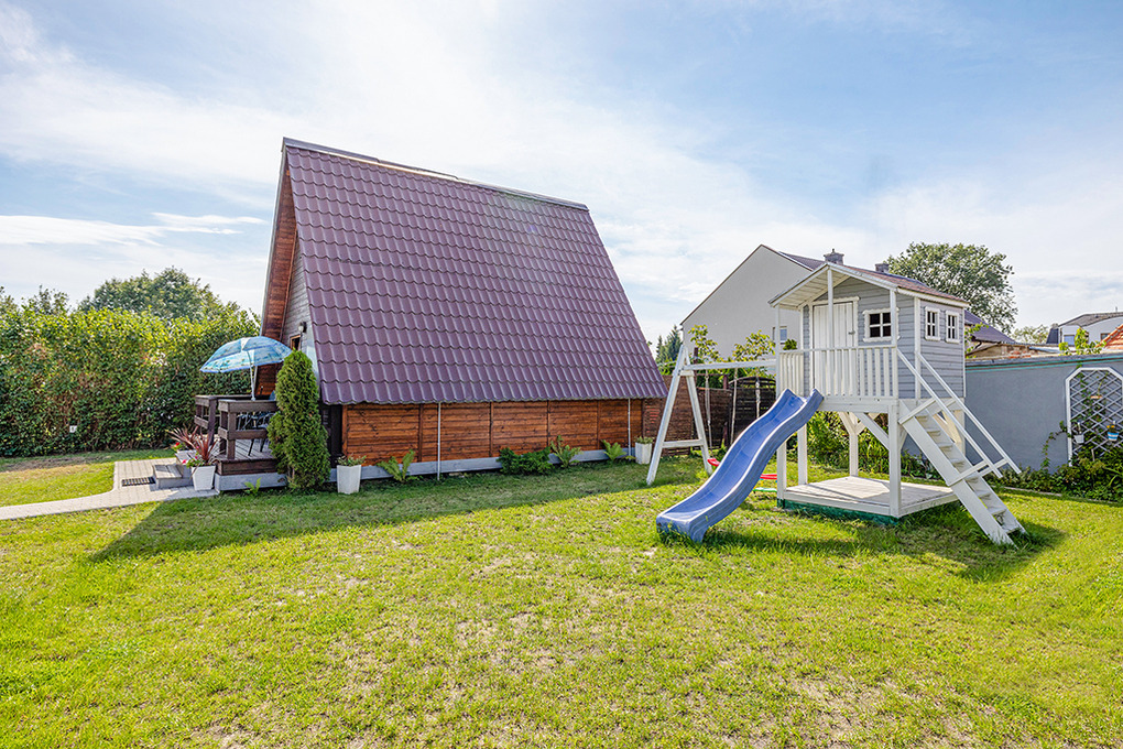 PL 44.10 Ferienhaus 2-6 Pers.: 3-Zimmerhaus mit 50 qm Wohnfläche über 2 Etagen. Parterre: Wohn-/Essraum mit Schlafcouch (2 Pers.), 2 Sesseln, rundem kleinen Bistrotisch, Sat-TV mit deutschen Programmen, Internet (WiFi), Esstisch, Küchenzeile (2 E-Heizplatten, Mikrowelle)). Bad/WC. Dachgeschoss: Doppelzimmer. 2-Bettzimmer. Schöne Holzterrasse mit Sitzmöbeln.