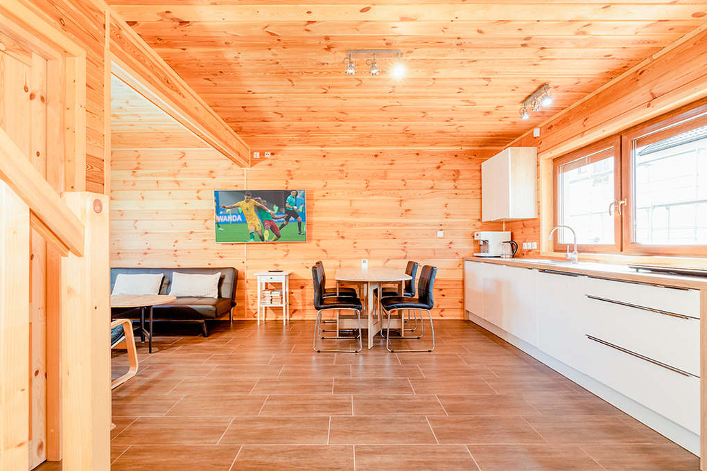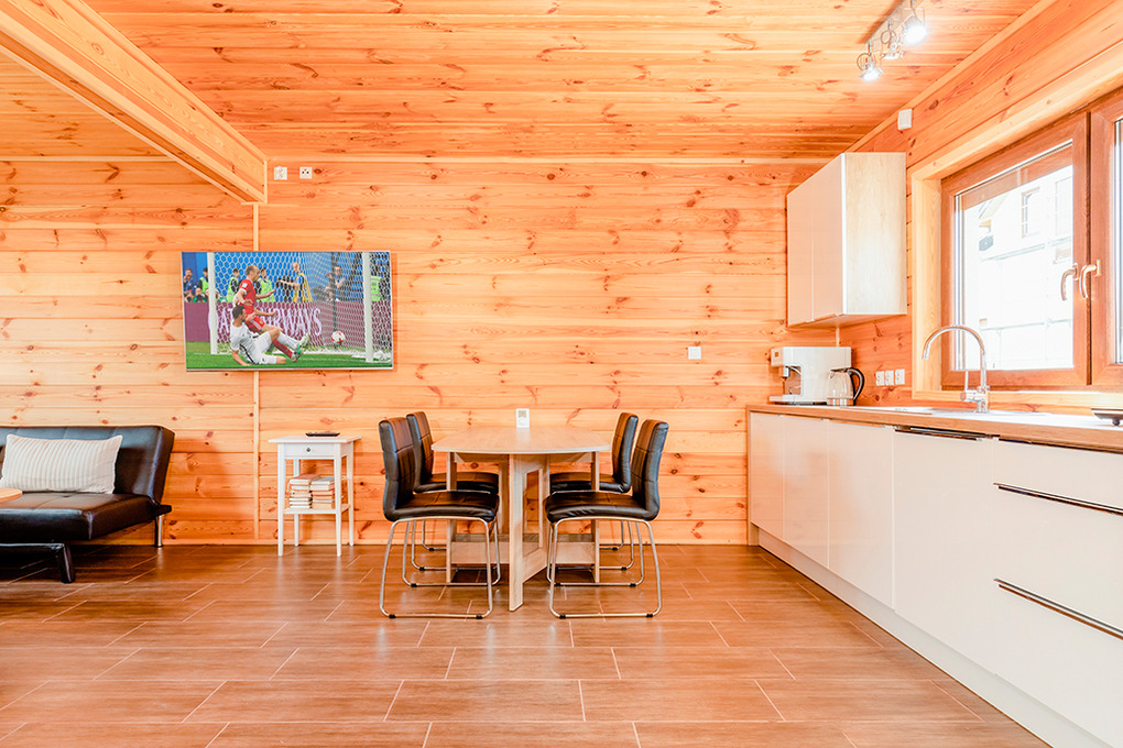 PL 50.9 Ferienhaus 2-5 Pers.: Sehr schönes 3-Zimmer-Ferienhaus mit 65 qm Wohnfläche über 2 Etagen. Parterre: Großzügiger Wohn-/Essraum mit Sofa (Klappcouch 1 Pers.), Couchtisch, Flachbild Sat-TV mit deutschen Programmen, Esstisch, moderner Küchenzeile (2 Platten-Induktionsherd). Sauna. Bad: Whirlpool, Wb, WC. Wendeltreppe ins Dachgeschoß: Doppelzimmer. 2-Bettzimmer mit Balkon. Bad: Dusche, Wb, WC. Terrasse mit Sitzmöbeln, Grill.