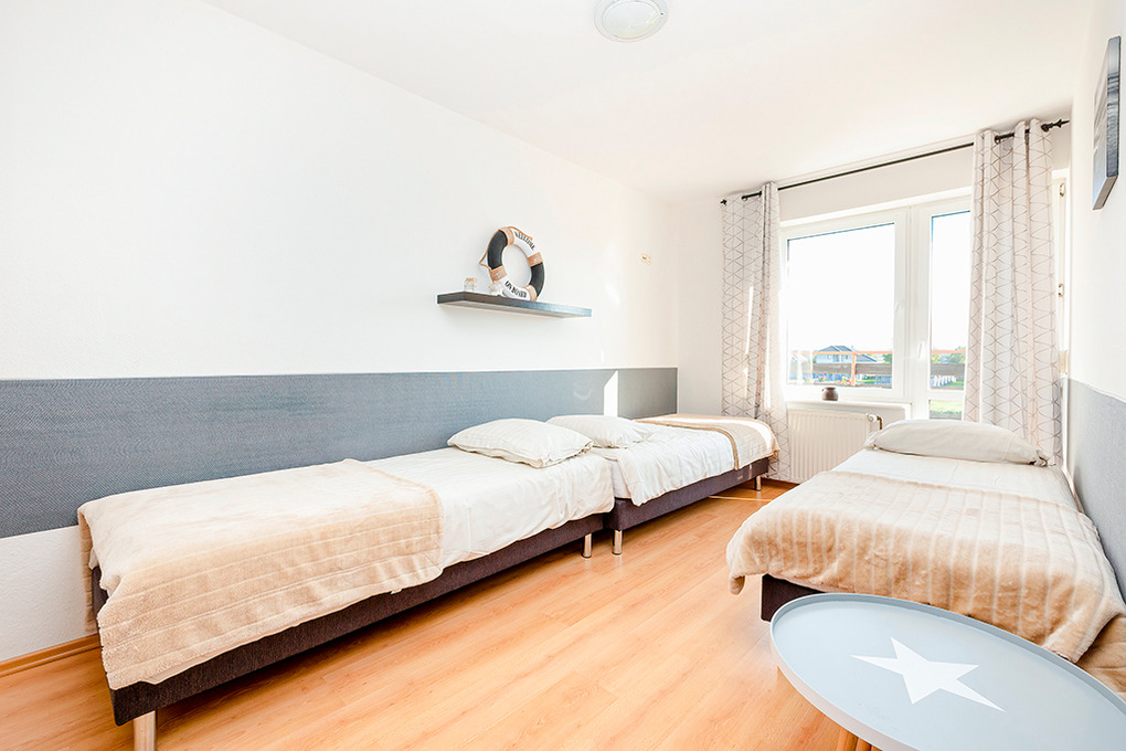 PL 50.28 Ferienhaus 2-12 Pers.: Geräumige 7-Zimmer-Doppelhaushälfte mit 170 qm Wohnfläche. Parterre: Doppelzimmer mit angrenzendem Bad mit ebenerdiger Dusche, Wb, WC. Wohn-Schlafraum mit Flachbild-TV, Küchenzeile mit 2 E-Platten Ceranfeld, Kühlschrank, bodentiefen Fenstern. 2 Einzelbetten und Klappcouch (160 cm Breite). Bad/WC. 1. Etage: Großzügiger, komfortabler, lichtdurchfluteter Wohn-/Essraum mit bodentiefen Fenstern, Kamin, großer Sitzgarnitur, Couchtisch, Flachbild Sat-TV (deutsche Programme), Esstisch. Balkon mit Sitzmöbeln. Funktionale Küche mit 4 E-Platten Ceranfeld, Backofen, Abzugshaube, großer Kühlgefrierkombination, Mikrowelle, Spülmaschine. Bad/WC. Dachgeschoß: 3-Bettzimmer mit franz. Bett, Einzelbett. Drei-Bettzimmer mit Einzelbetten. Balkon. Doppelzimmer mit franz. Bett. Balkon. Bad mit Badewanne, Wb, WC, Waschmaschine. Überdachte Terrasse mit Sitzmöbeln, davor Garten mit gemauertem Grill, Gartenmöbeln.