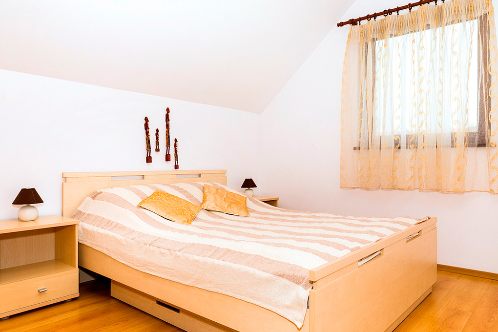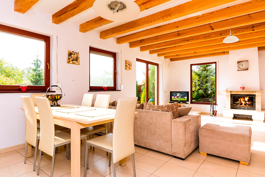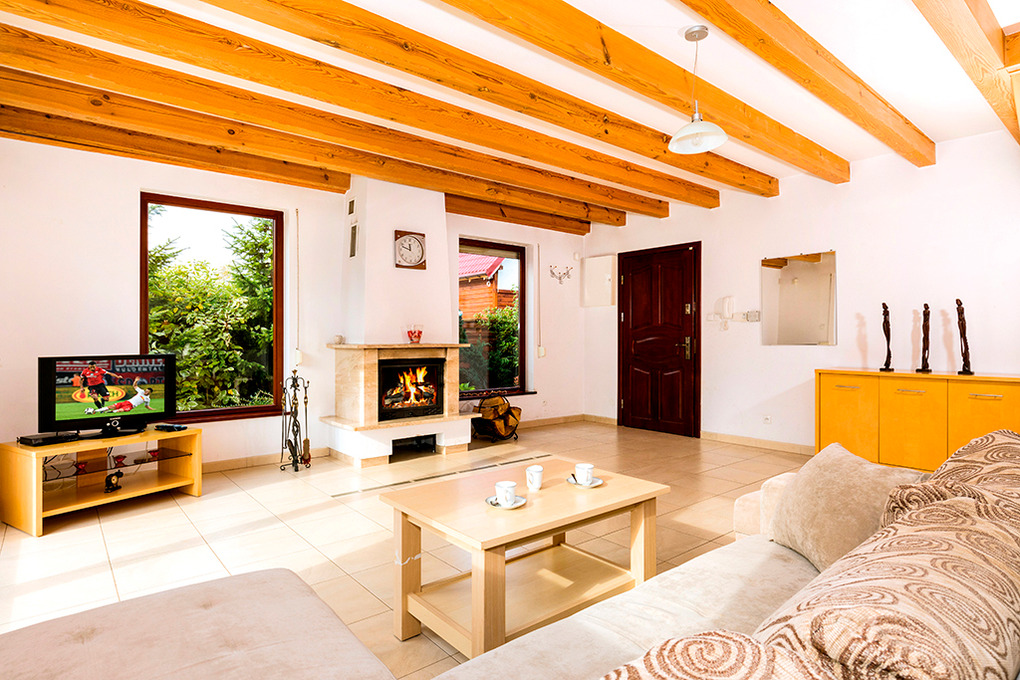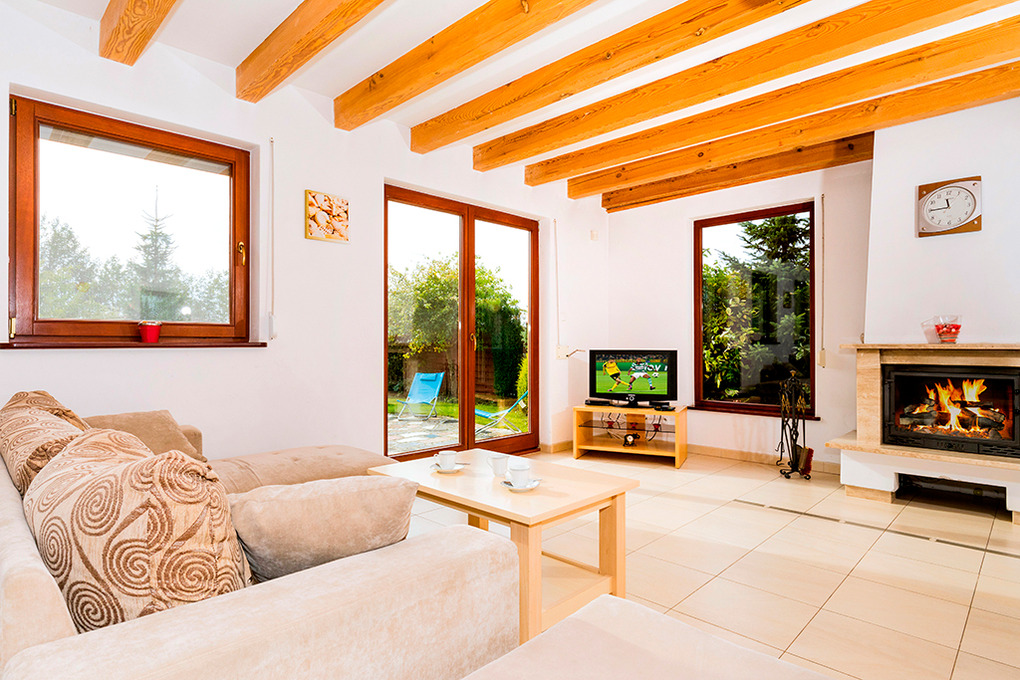 PL 55.1 Ferienhaus 3-8 Pers.: Niveauvolles 4-Zimmerhaus mit 90 qm Wohnfläche über 2 Etagen. Parterre: Großzügiger Wohn-/Essraum mit Kamin, Sitzgarnitur (Ausziehsofa für 2 Pers.), Flachbild Kabel-TV (deutsche Programme), Esstisch, gut ausgestattetem Küchenbereich (E-Herd 4-Pl., Abzugshaube, Backofen, Spülmaschine). Bad: Bw, Wb, WC. 1. Etage: 2 Doppelzimmer. 2-Bettzimmer mit Ausziehsofa. Bad/WC.