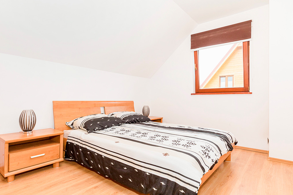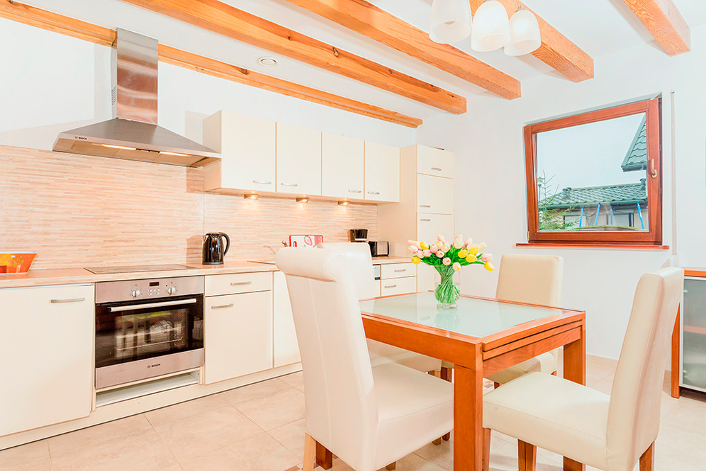 PL 55.2 Ferienhaus 3-8 Pers.: Niveauvolles 4-Zimmerhaus mit 90 qm Wohnfläche über 2 Etagen. Parterre: Großzügiger Wohn-/Essraum mit Kamin, Sitzgarnitur (Ausziehsofa für 2 Pers.), Flachbild Sat-TV (deutsche Programme), Esstisch, gut ausgestattetem Küchenbereich (E-Herd 4-Pl., Abzugshaube, Backofen, Spülmaschine). Bad: Bw, Wb, WC. 1. Etage: 3 Doppelzimmer. Bad/WC.