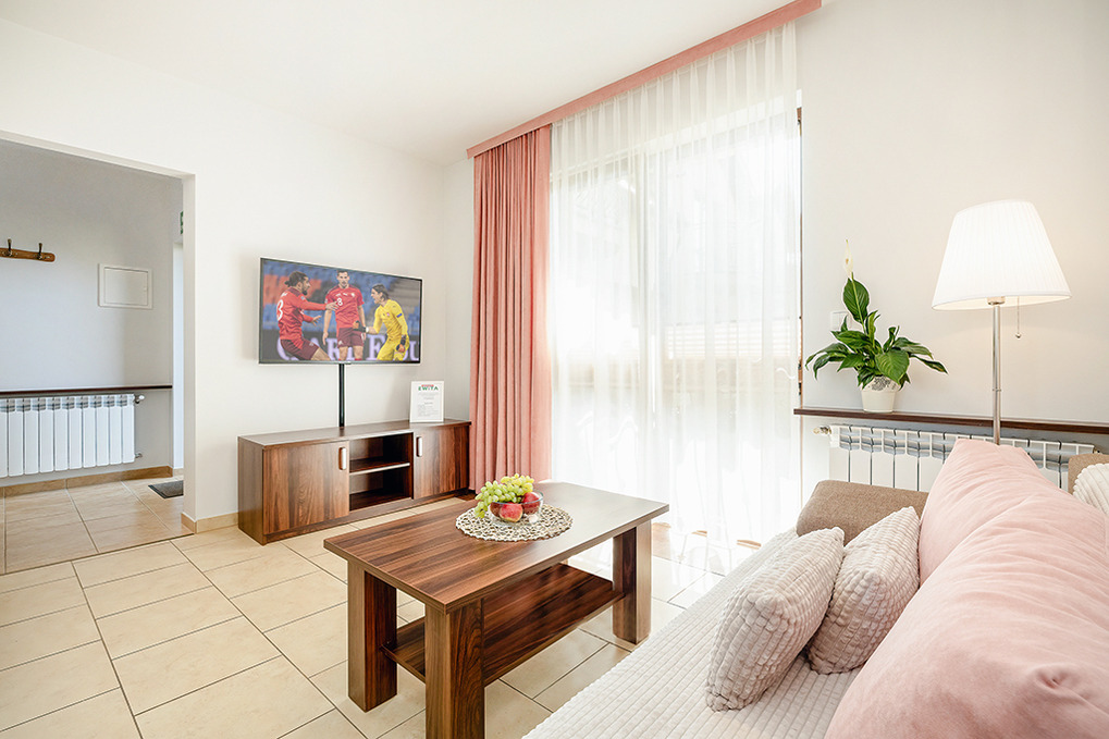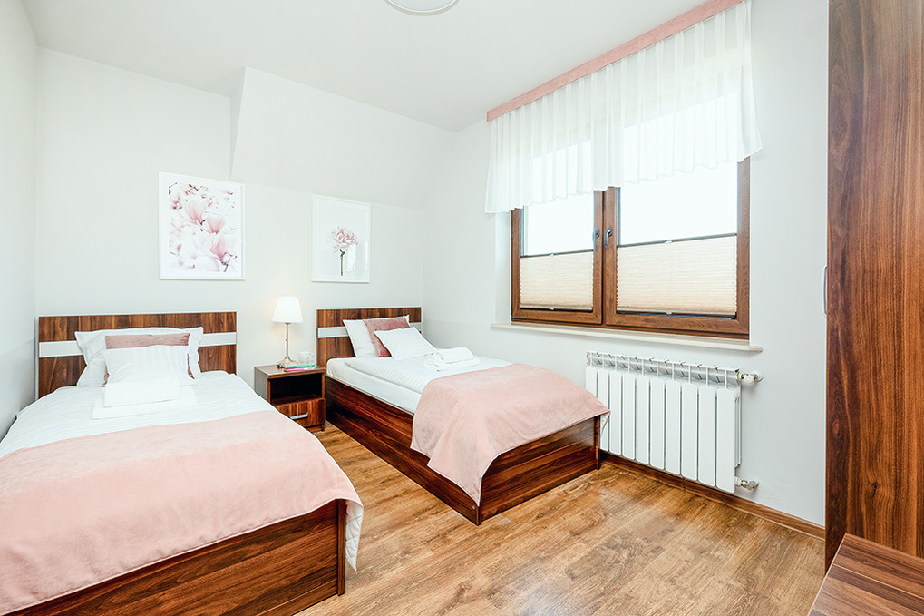 PL 55.9 Ferienhaus 2-6 Pers.: 3-Zimmer-Reihenhaus mit ca. 60 qm Wohnfläche über 2 Etagen. Parterre: Wohn-/Essraum mit Couchgarnitur (Ausziehsofa 2 Pers.), Flachbild Kabel-TV, Esstisch, Küchenzeile (2 E-Platten). Bad/WC. 1. Etage: Doppelzimmer mit kleinem Balkon. 2 Bettzimmer. Bad: Wb, WC.