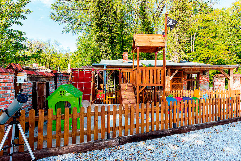 Haus: Gepflegte Ferienhausanlage auf einem großzügigen, umzäunten Grundstück mit Rezeption, Kinderspielplatz mit Schaukel, Sandkasten, Klettergerüst.