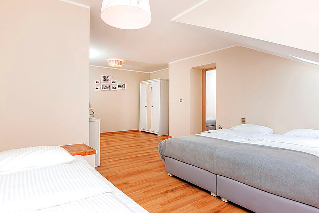 PL 55.18 Ferienwohnung 2-6 Pers.: 3-Zimmer-Reihenhaus mit 45 qm Wohnfläche über 2 Etagen. Parterre: Wohn-/Essraum mit Esstisch, Flachbild Sat-TV, Küchenzeile (2 Pl. E-Herd). Bad/WC. Treppe ins ausgebaute Dachgeschoss: 4-Bettzimmer mit Doppelbett, 2 Einzelbetten, offen zur Treppe. Dahinter Doppelzimmer.