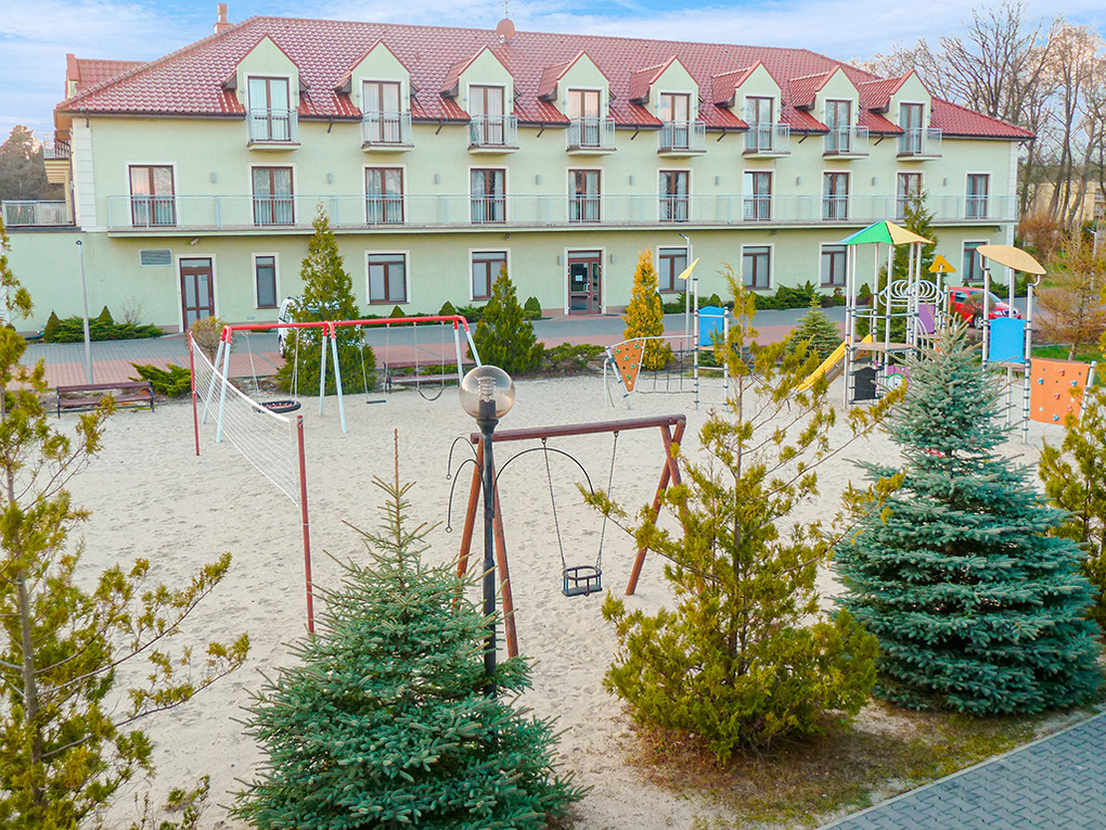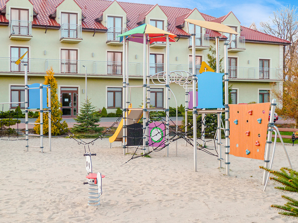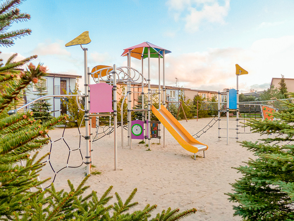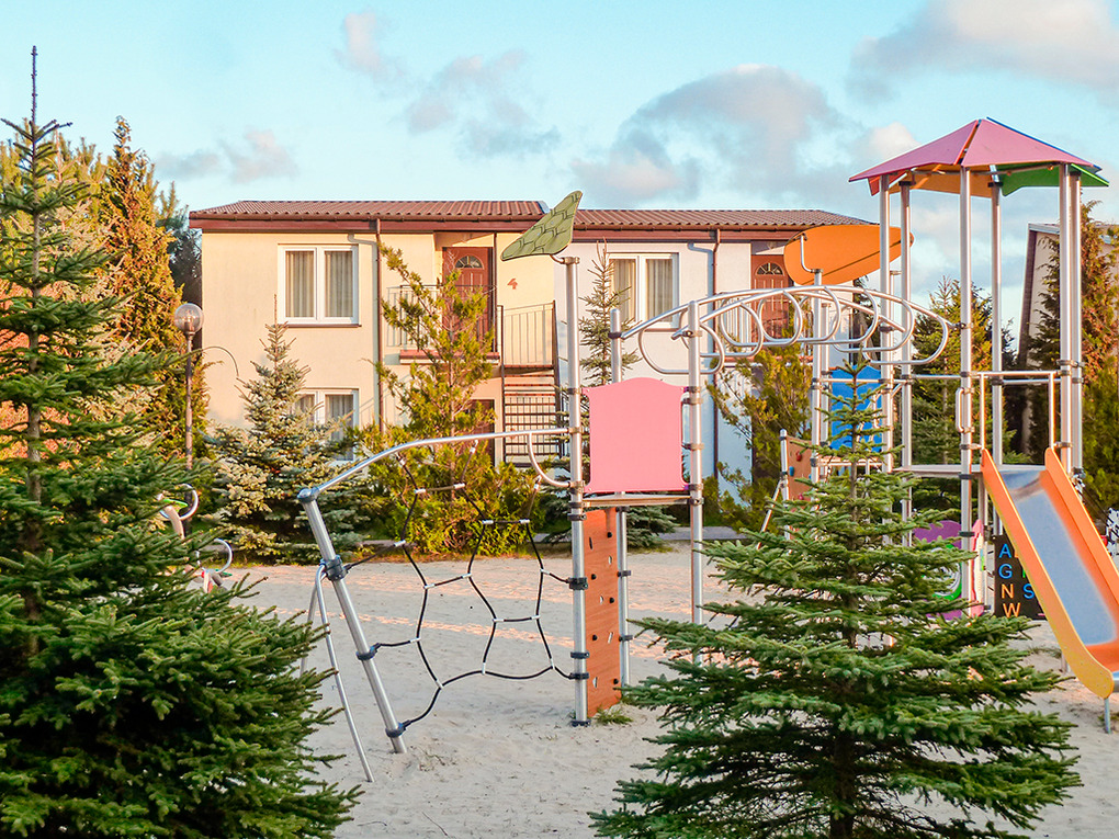 In der Anlage: Rezeption. Restaurant. Hotelhallenbad mit Whirlpool, Sauna, Dampfbad, Fitnessraum, Spielzimmer mit Kletterwald, Bällebad, Spielzeug (im Mietpreis inklusiv). Vielseitiges Angebot an Beautyanwendungen. Großer Kinderspielplatz mit Rutschen, Sandkasten, Schaukeln, Wippen, Volleyballfeld. Lagerfeuerstelle. Grillplatz zur gemeinschaftlichen Nutzung. Pkw-Stellplätze auf umzäuntem, bewachtem Parkplatz (Gebühr).