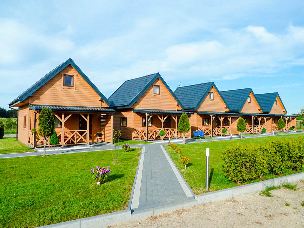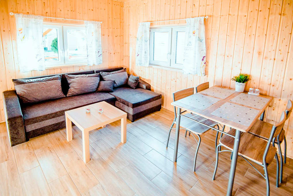PL 85.15 Ferienhaus 2-8 Pers.: Komfortables 3-Zimmer-Ferienhaus mit 50 qm Wohnfläche über 2 Etagen. Parterre: Wohn-/Essraum mit Eckcouch (Ausziehcouch 2 Pers.), Flachbild-TV, Esstisch, Küchenzeile (2 E-Platten Induktionsfeld, Abzugshaube). Bad: Du, Wb, WC. Vom Wohnraum Holztreppe ins Dachgeschoss: Zwei 3-Bettzimmer mit Doppelbett, Einzelbett. Überdachte Terrasse mit Sitzmöbeln, Grill.