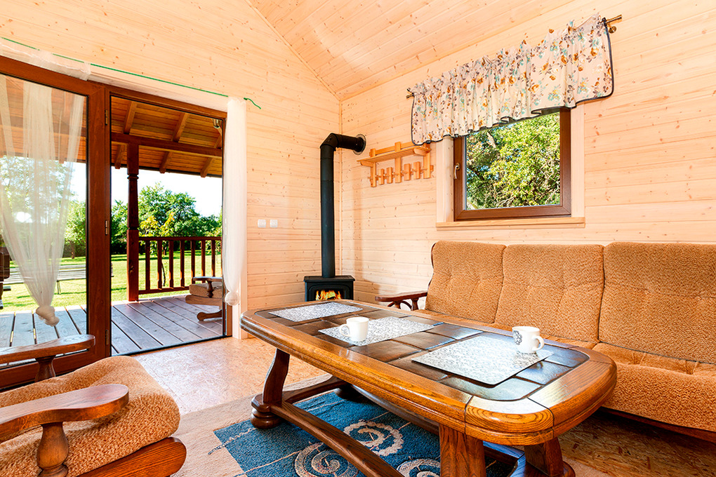 PL 326.144B Ferienhaus 2-6 Pers.: Schönes 3-Zimmerhaus mit 38 qm Wohnfläche. Wohn-/Essraum, Klappcouch (Schlafsofa 2 Pers.), SAT-TV (dt Programme), Esstisch, Küchenecke (4 Fl. Gasherd). Bad/WC. Doppelzimmer. 2-Bettzimmer. Gemütliche, überdachte Terrasse mit Sitzmöbeln und schönem Blick in den Garten.