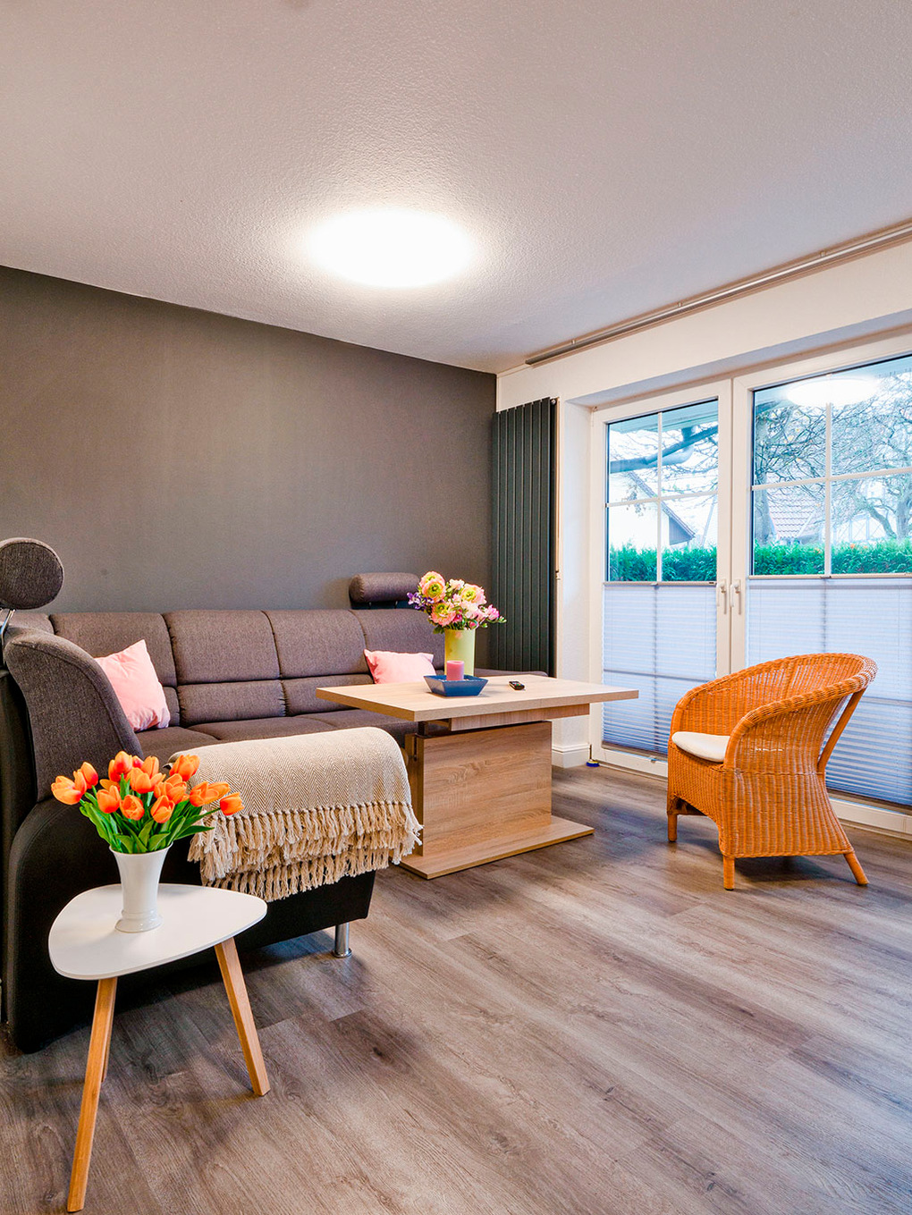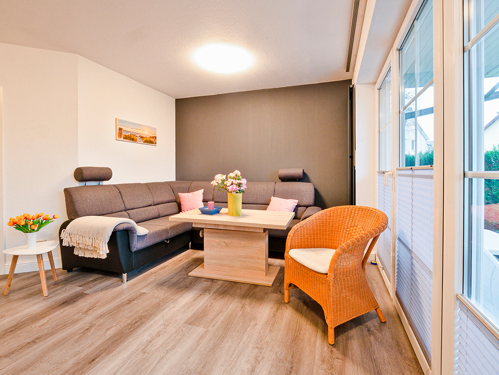 Haus: Schöne, moderne Reihenhäuser mit jeweils 5 Ferienwohnungen. Freundliche, geschmackvolle Einrichtung. Jede Fewo mit Sat-TV, Spülmaschine, meist auch mit Waschmaschine. Zentralheizung. Größtenteils mit Terrasse oder Balkon. Nichtraucherwohnungen. 1 Pkw-Stellplatz /Fewo.