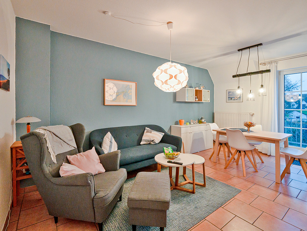 Haus: Schöne, moderne Reihenhäuser mit jeweils 5 Ferienwohnungen. Freundliche, geschmackvolle Einrichtung. Jede Fewo mit Sat-TV, Spülmaschine, meist auch mit Waschmaschine. Kostenloser Internetzugang über W-Lan. Zentralheizung. Nichtraucherwohnungen. 1 Pkw-Stellplatz /Fewo.