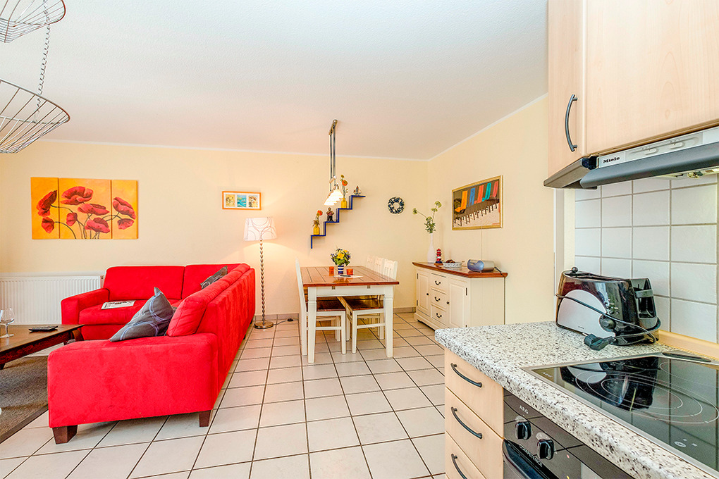 D 67.3302 Wohnung 1-4 Pers.: 3-Zimmerwohnung, 68 qm Wohnfläche, Parterre. Wohn-/Essraum mit Sitzgarnitur, Sat-TV, Esstisch, moderner Küchenzeile (Backofen, Spülmaschine). Doppelzimmer. 2-Bettzimmer mit Etagenbett. Bad: Du, Wb, WC, Waschmaschine. Terrasse.