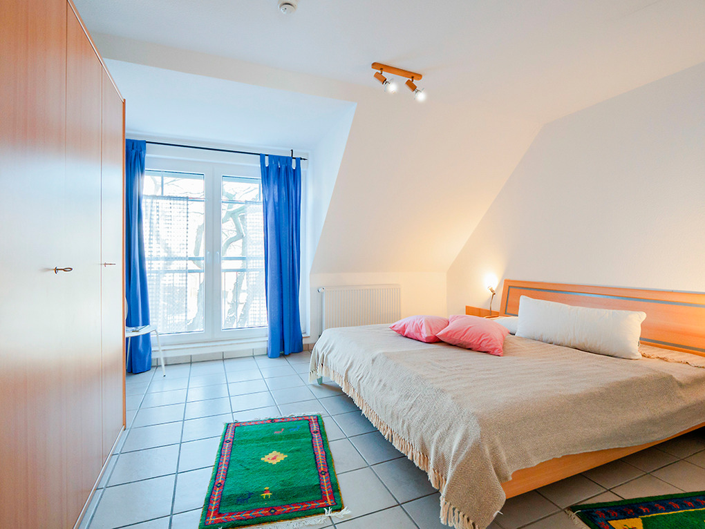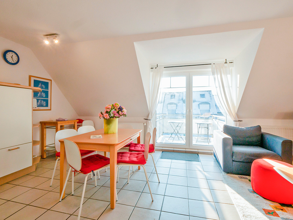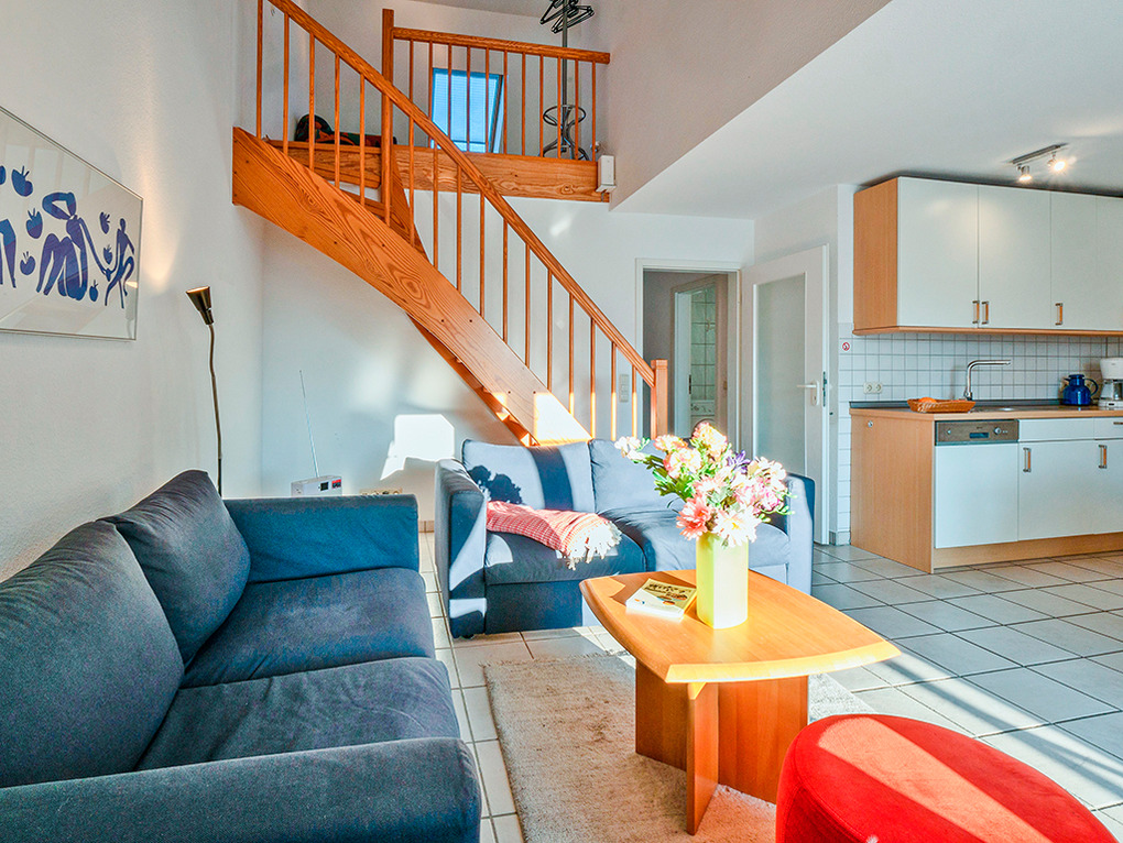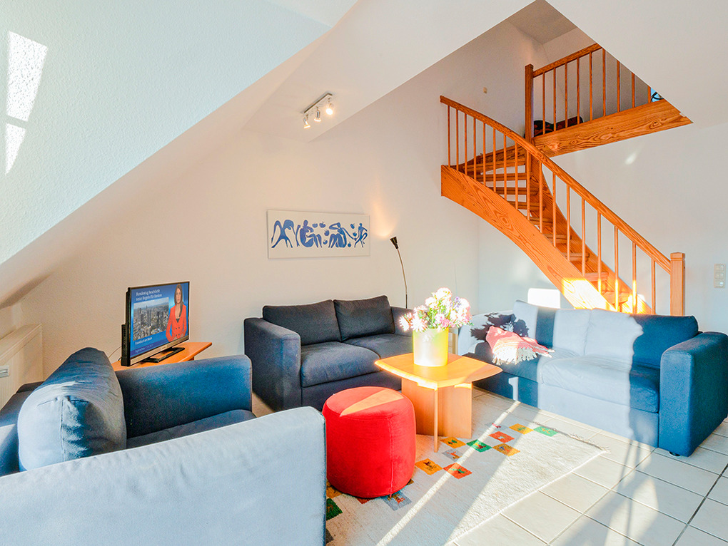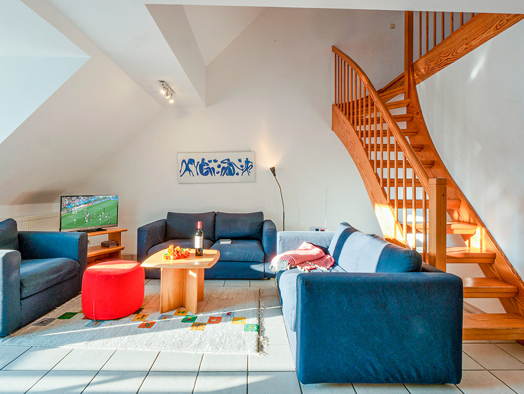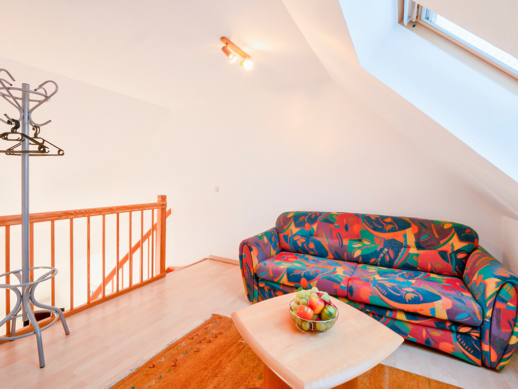 D 67.3305 Wohnung 1-6 Pers.: 3-Zimmer-Nichtraucherwohnung mit 77 qm Wohnfläche über 2 Etagen, 1. Etage. Wohn-/Essraum mit Sitzgarnitur, Sat-TV, Esstisch, Küchenzeile (Backofen, Spülmaschine). Doppelzimmer. Bad/WC. Treppe ins ausgebaute Dachgeschoss: Doppelzimmer. Ausziehcouch (2 Pers.) auf offener Galerie. Bad: Du, Wb, WC, Waschmaschine. Balkon.