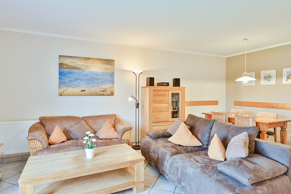 Haus: Drei Apartmenthäuser mit großzügigen, komfortablen Ferienwohnungen auf parkähnlich angelegtem Grundstück. Geschmackvolle, freundliche Einrichtung. Jede Fewo mit Spülmaschine, Waschmaschine. Zentralheizung. Terrasse oder Balkon jeweils mit Sitzmöbeln. Kostenloser Internetzugang über W-Lan. Gemeinschaftlicher Garten mit Rasenfläche. 1 Pkw-Stellplatz/Fewo.