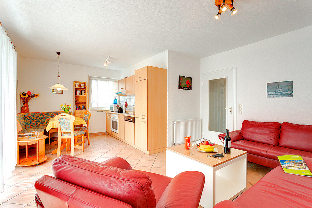 D 67.3513 Wohnung 1-4 Pers.: 3-Zimmer-Nichtraucherwohnung, 68 qm Wohnfläche, Parterre. Wohn-/Essraum mit Sitzgarnitur, Sat-TV, Esstisch, moderner Küchenzeile (Backofen, Mikrowelle, Spülmaschine). Doppelzimmer. Kleines 2-Bettzimmer. Bad: Du, Wb, WC, Waschmaschine. Terrasse.