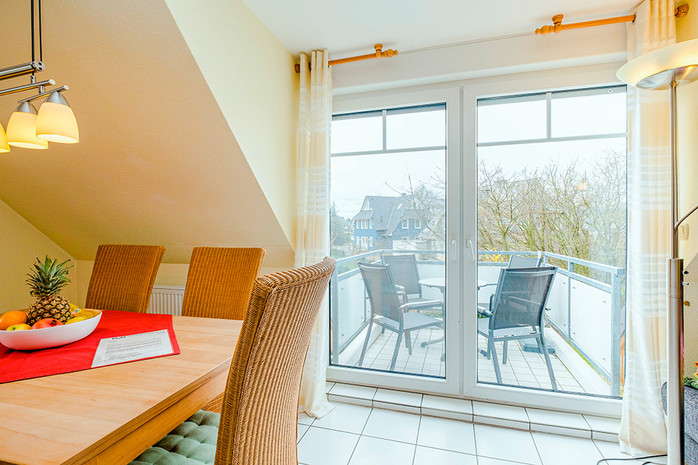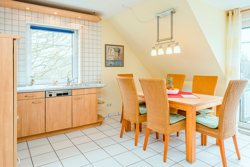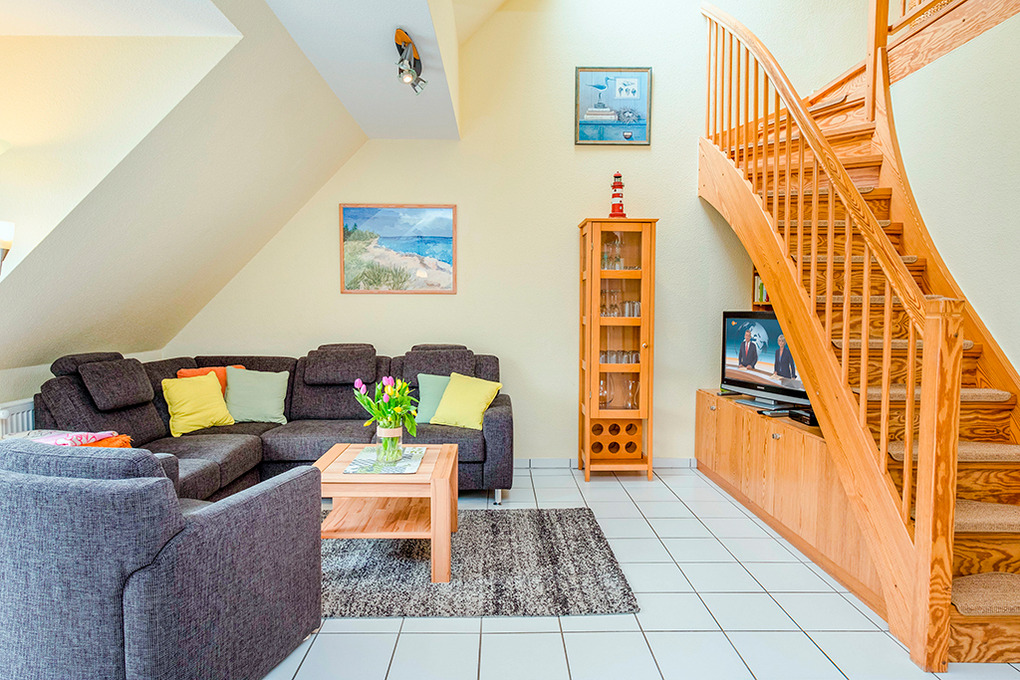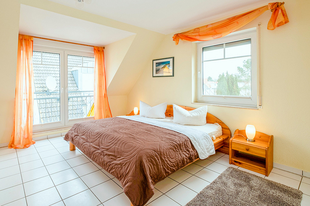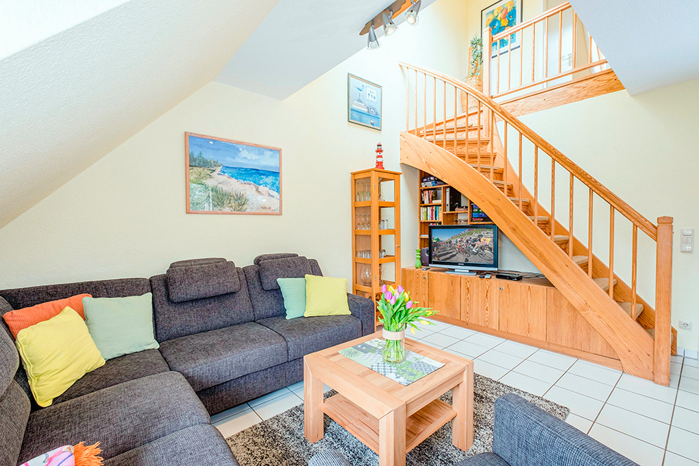 D 67.3518 Wohnung 1-6 Pers.: 4-Zimmerwohnung mit 75 qm Wohnfläche über 2 Etagen, 1. Etage. Wohn-/Essraum mit Sitzgarnitur, Sat-TV, Esstisch, Küchenzeile (Backofen, Mikrowelle, Spülmaschine). Doppelzimmer. Bad: Du, Wb, WC, Waschmaschine. Treppe ins ausgebaute Dachgeschoss: französisches Doppelzimmer mit Sat-TV. 2-Bettzimmer (Bettengröße 190cm). Bad/WC. Balkon.