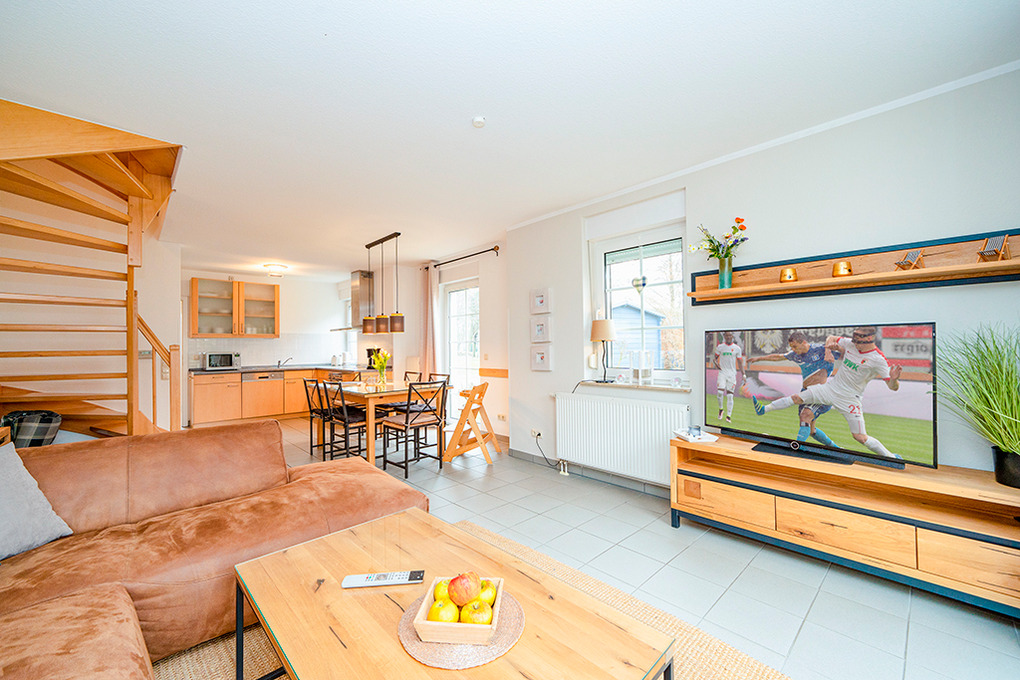 D 67.5304 Ferienhaus 1-6 Pers.: Schöne, großzügige 4-Zimmerhaushälfte mit 85 qm Wohnfläche über 3 Etagen. Nichtraucherhaus. Parterre: Heller, freundlicher Wohn-/Essraum mit gemütlicher Couchgarnitur, Sat-TV, Stereoanlage, Esstisch, moderner Einbauküche (Backofen, Mikrowelle, Spülmaschine). Bad: Du, Wb, WC. 1. Etage: 2 Doppelzimmer. Bad: Du, Wb, WC, Waschmaschine. Treppe in den offenen Spitzboden: 2-Bettzimmer.
