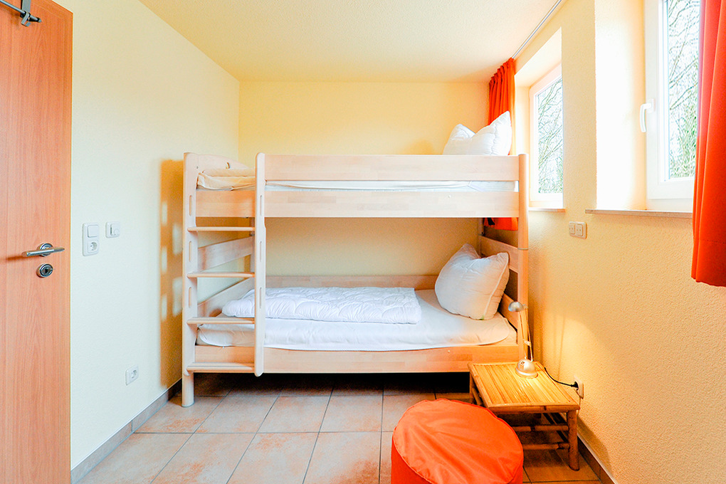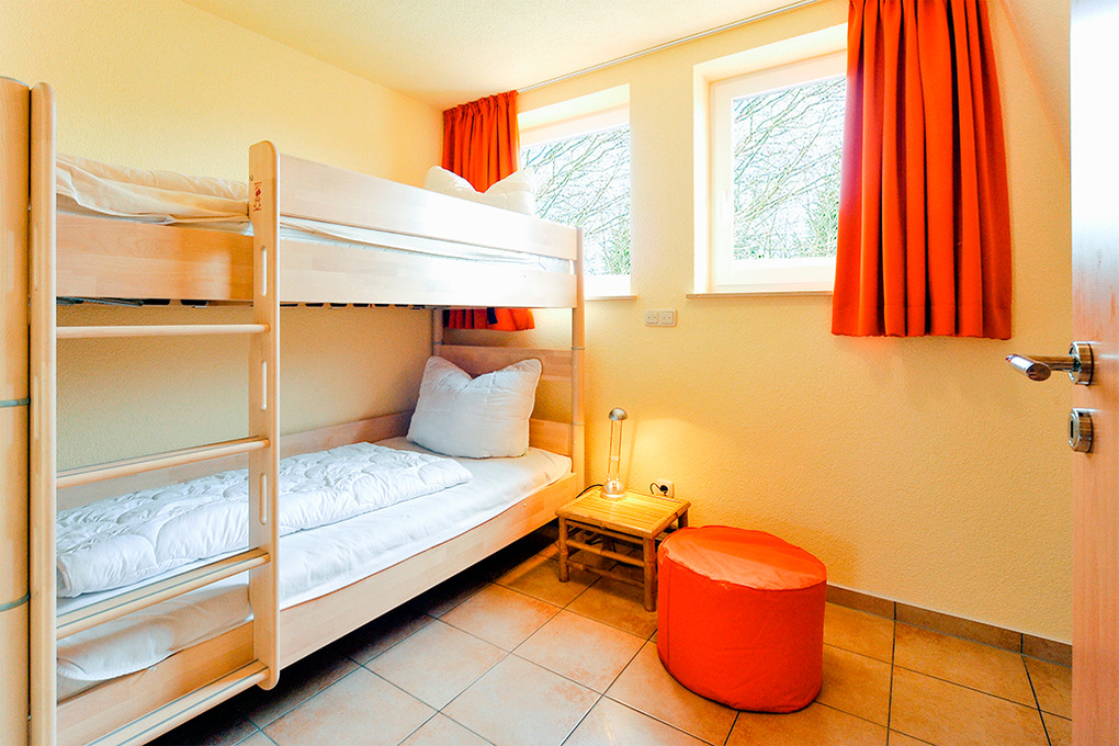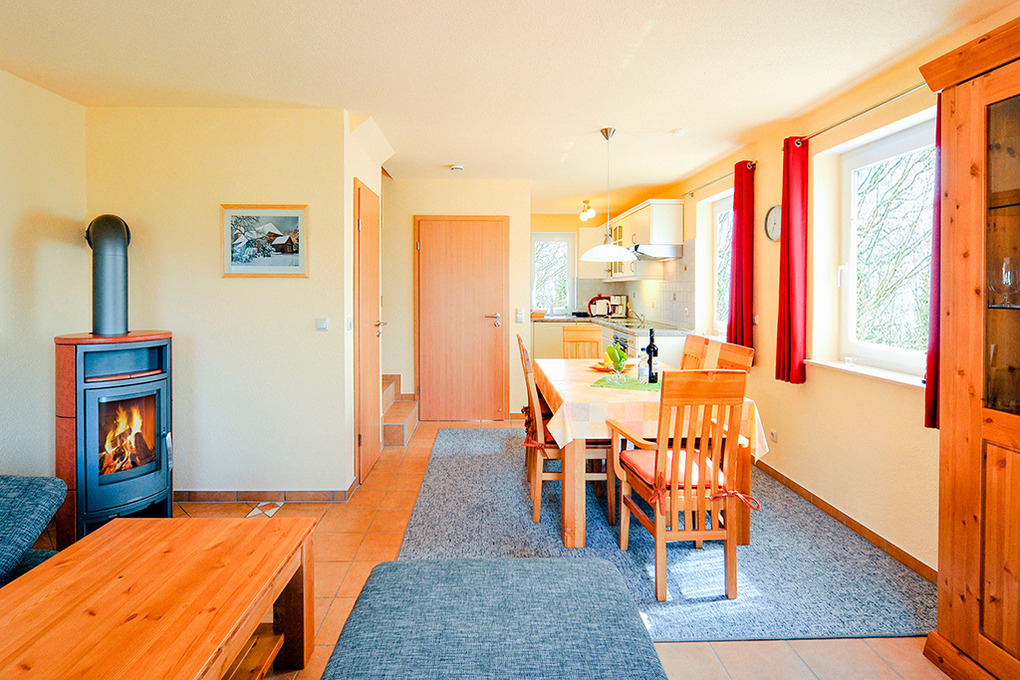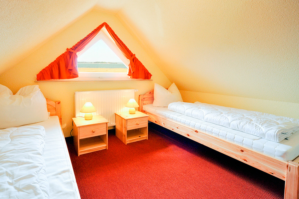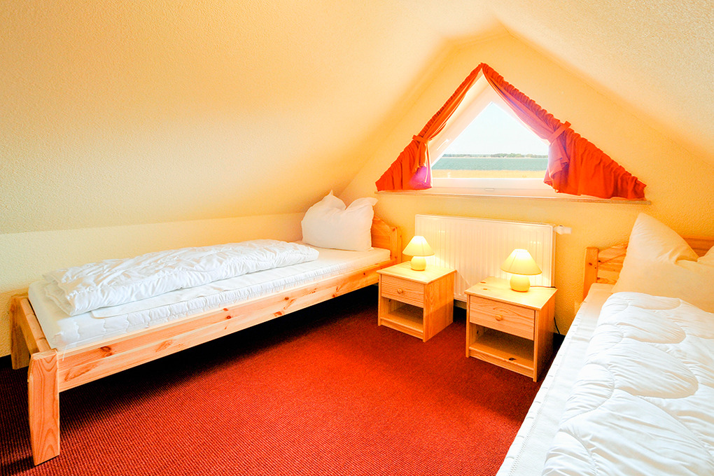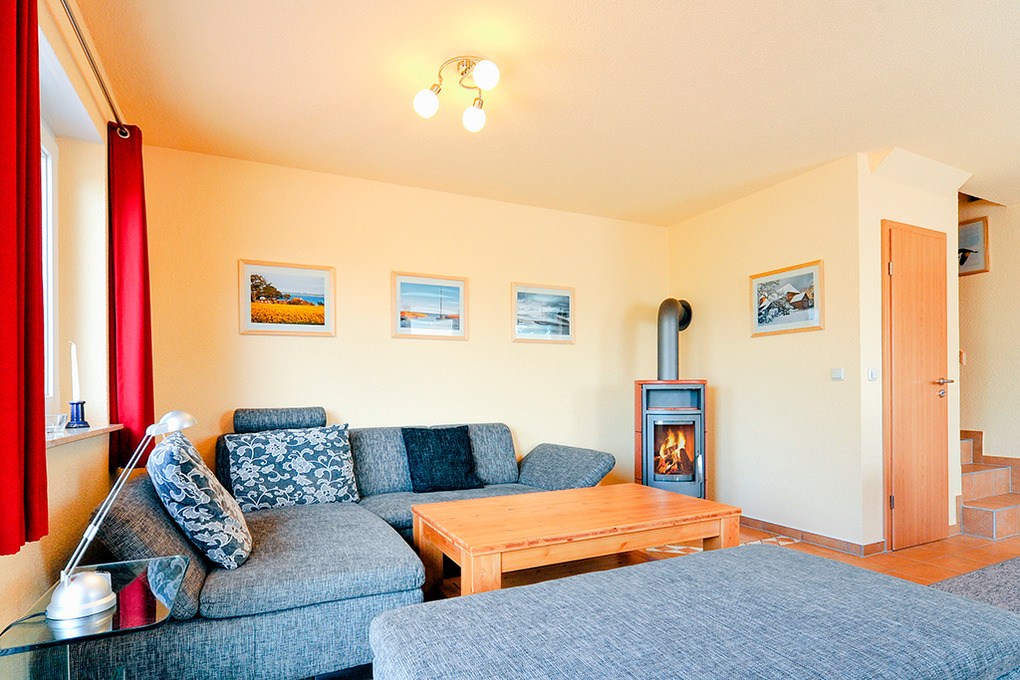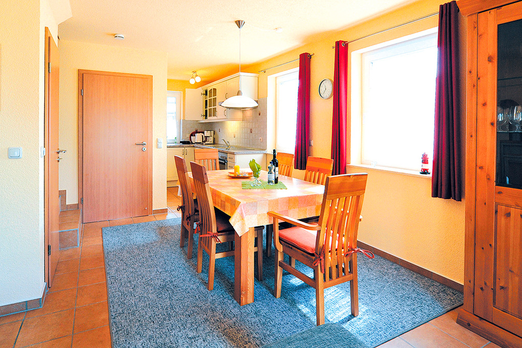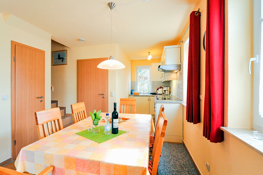 D 68.61 Ferienhaus 1-6 Pers.: 4-Zimmerhaushälfte mit 75 qm Wohnfläche über 3 Etagen. Parterre: Großzügiger, heller Wohn-/Essraum mit Kaminofen, gemütlicher Couchgarnitur, Flachbild-Sat-TV, Esstisch, moderner Küchenzeile (Backofen, Spülmaschine). Separates WC. 1. Etage: Doppelzimmer. 2-Bettzimmer mit Etagenbett. Großes Bad: Bw, Du, 2 Wb, WC. Treppe in den Spitzboden: 2-Bettzimmer.