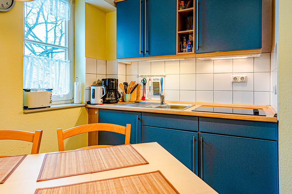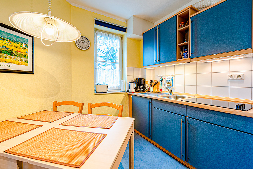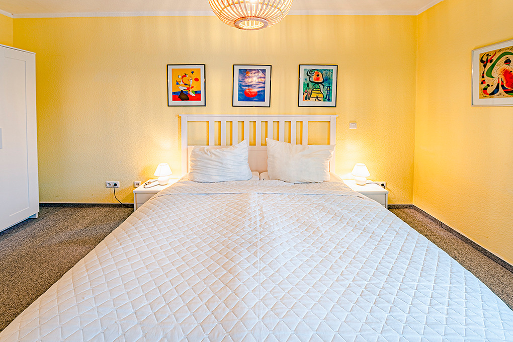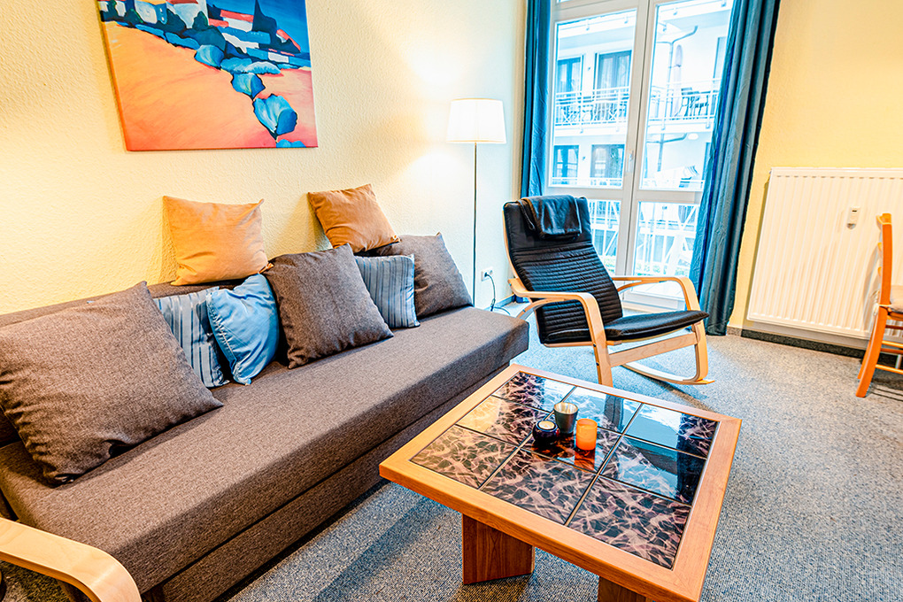 D 90.30 Wohnung 2-4 Pers.: Geschmackvolle 2-Zimmerwohnung mit 42 qm Wohnfläche, 1. Etage. Großer, heller Wohn-/Essraum mit Couchgarnitur (Ausziehcouch 2 Pers.), Kabel-TV, Radio, Esstisch, moderner Küchenzeile. Doppelzimmer. Bad/WC. Balkon mit Sitzmöbeln.