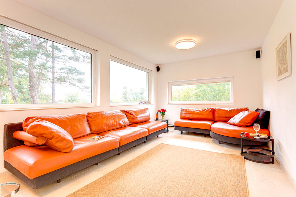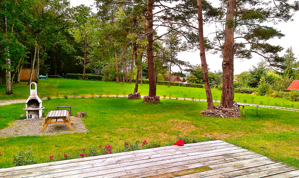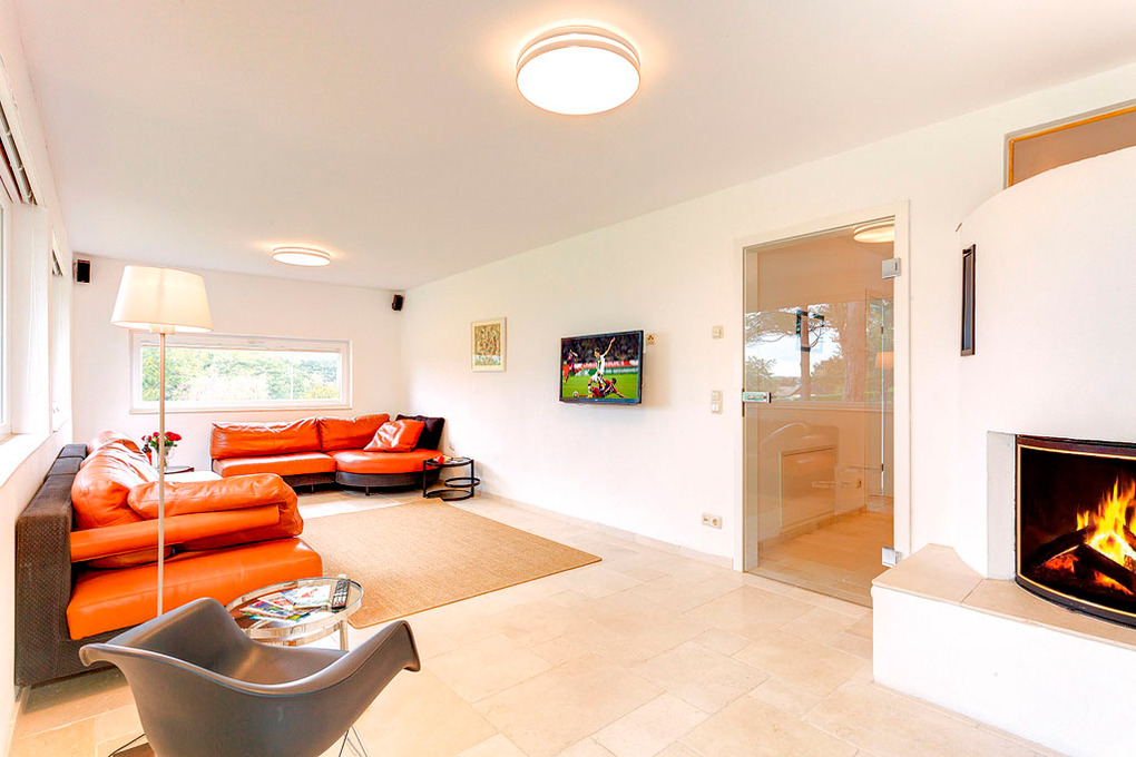Haus: Modernes Ferienhaus mit schönem Kamin auf einem großen, abgeschlossenen Gartengrundstück (6000 qm). Parkähnliche Anlage mit Rasenflächen und altem Baumbestand. Großzügige, offene Bauweise, breite Fensterfronten mit herrlichem Blick in den Garten. Hochwertige, geschmackvolle Einrichtung. 3 Schlafzimmer mit eigenem Bad. Kostenloser Internet-Zugang über WLan. Fußbodenheizung. Terrasse mit gemütlichen Sitzmöbeln, gemauertem Grill. 4 Pkw-Stellplätze am Haus.
