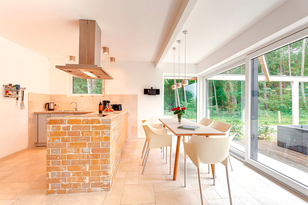 D 90.310 Ferienhaus 2-6 Pers.: Großzügiges 4 1/2-Zimmerhaus mit 110 qm Wohnfläche. Gemütliches Wohnzimmer mit schönem großen Kamin, 2 Sofas, Flachbild Sat-TV. Heller freundlicher Küchen-/Essraum mit breiter Fensterfront, Esstisch, frei stehendem Küchenblock (Backofen, Abzugshaube, Spülmaschine). 3 Doppelzimmer mit Bad/WC.