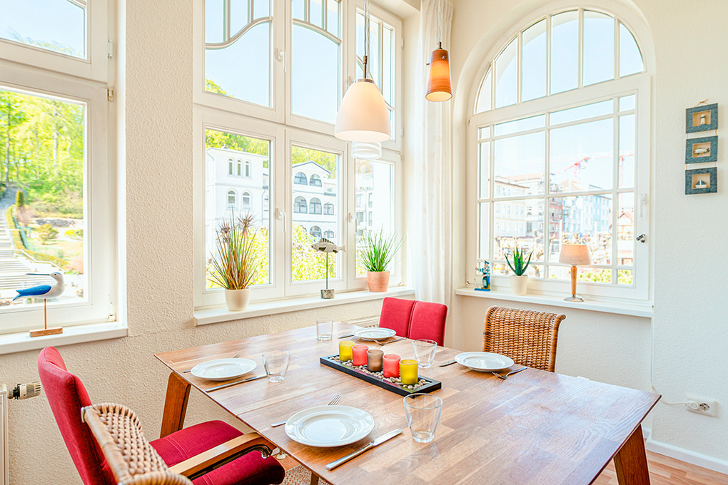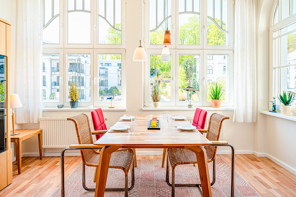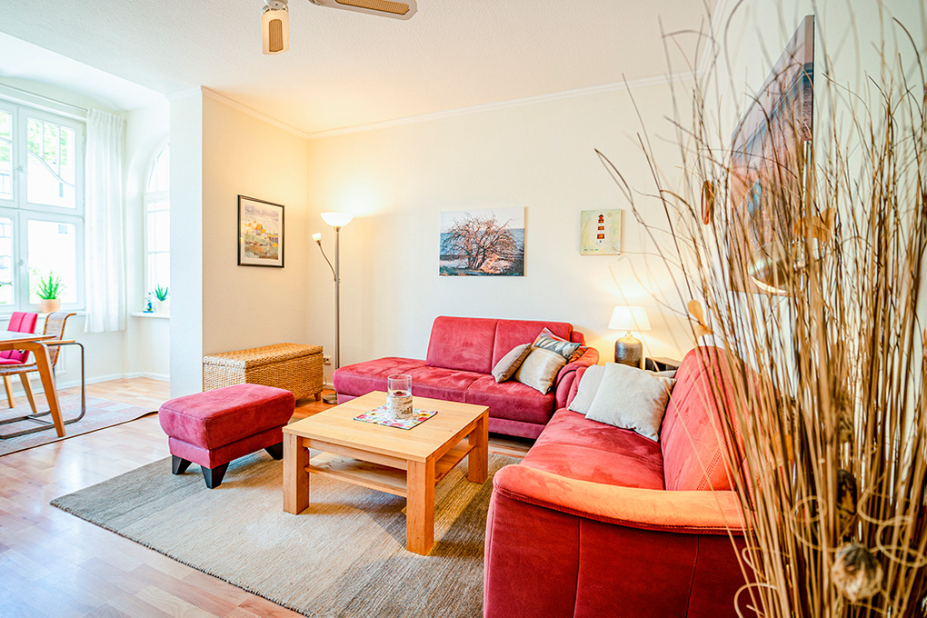 Haus: Restaurierte, denkmalgeschützte Villa im Stil der Bäderarchitektur mit 6 komfortablen Ferienwohnungen. Zentralheizung. Kostenloser Internetanschluss (W-Lan). Münz-Waschmaschine, Trockner. 1 Tiefgaragen-Stellplatz/Fewo (300 m).