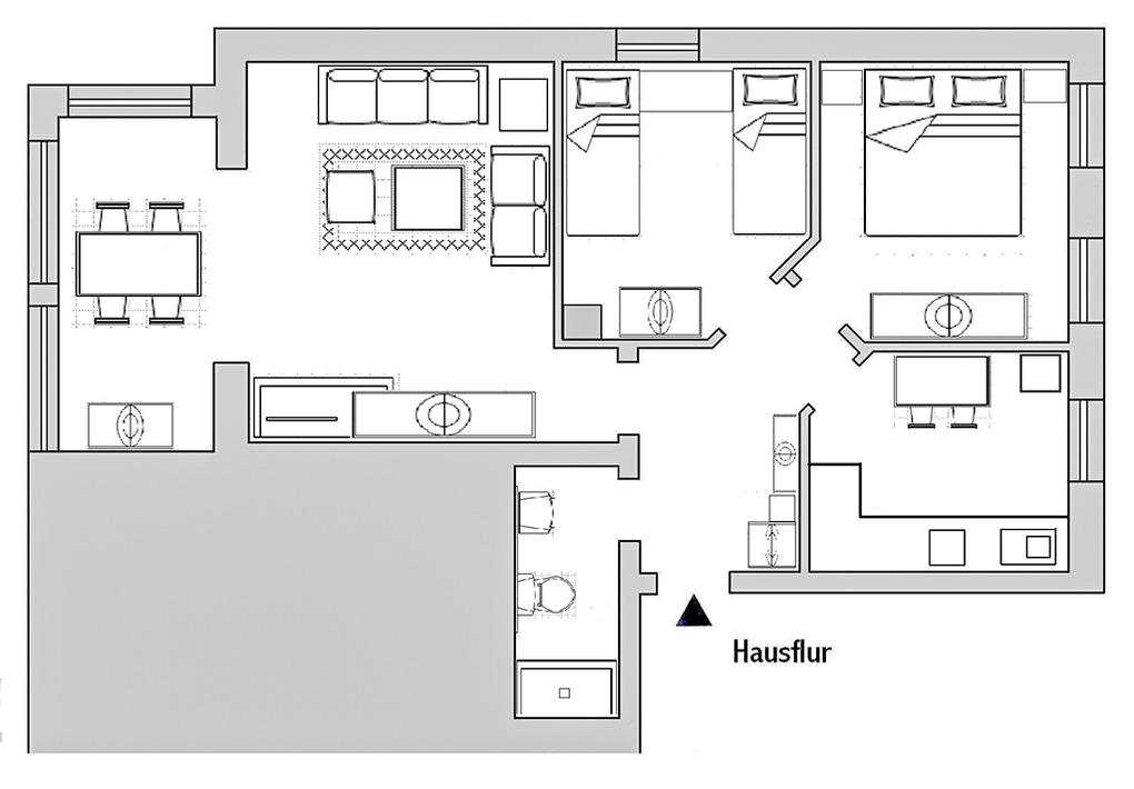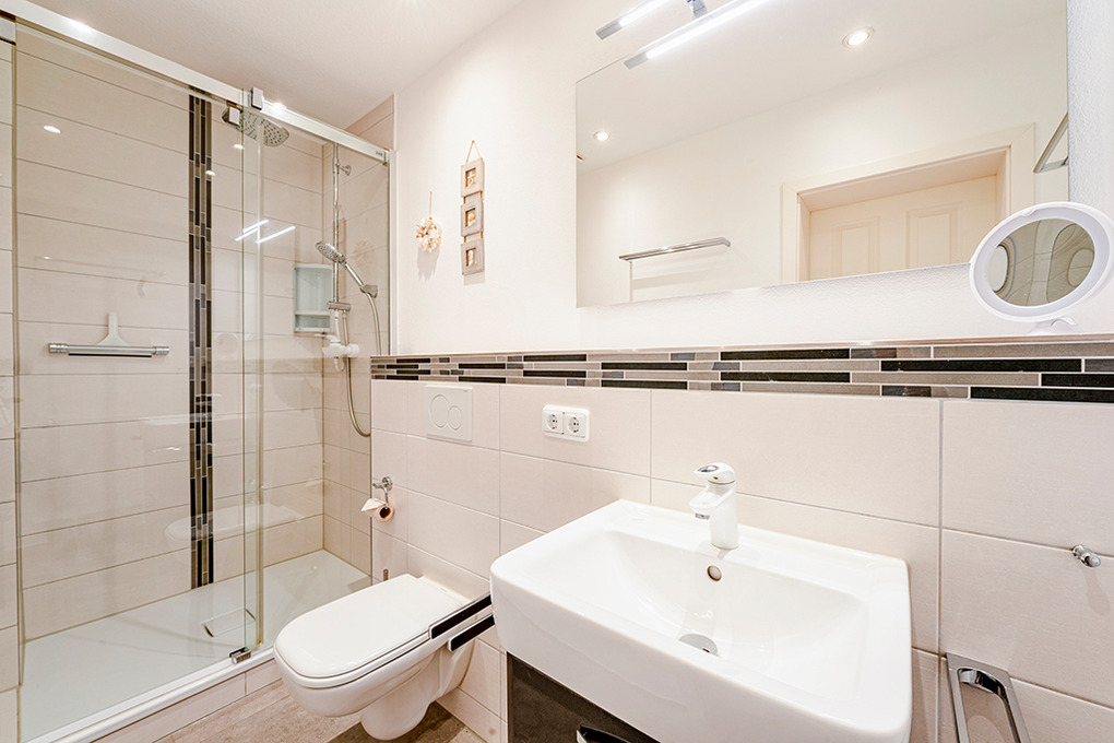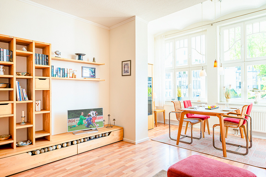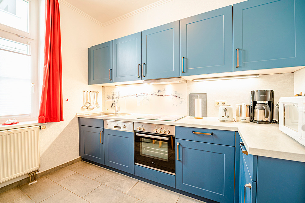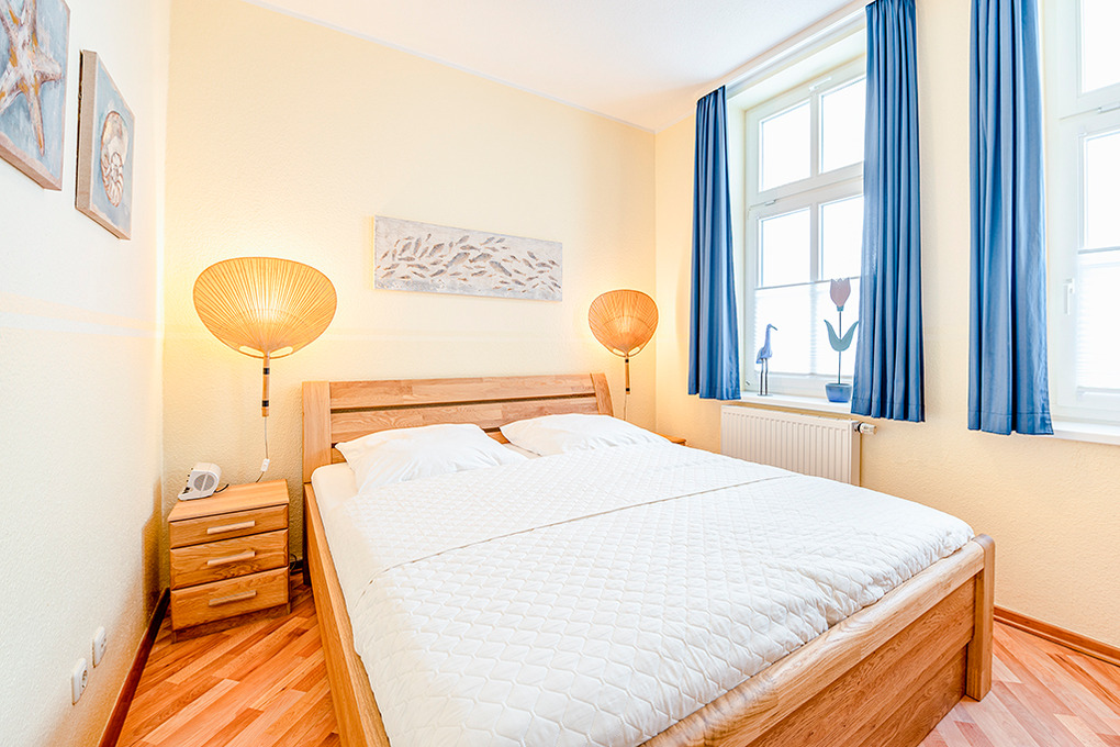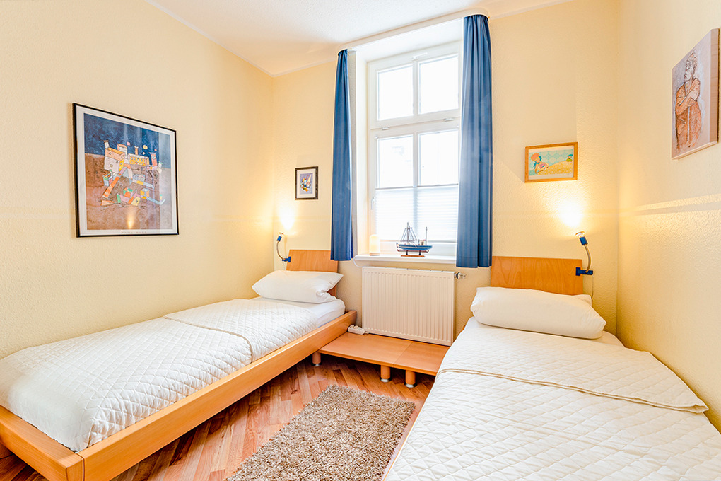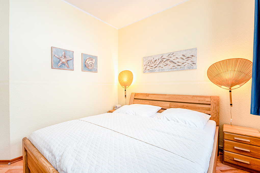 D 91.10 Wohnung 2-4 Pers.: Schöne, geräumige 3-Zimmerwohnung, 65 qm Wohnfläche, Hochparterre. Gemütlicher Wohnraum mit Sitzgarnitur, Smart-TV, Radio, Esstisch im Erker. Gut ausgestattete Küche (Backofen, Mikrowelle, Spülmaschine). Doppelzimmer. 2-Bettzimmer mit Kabel-TV. Bad/WC.