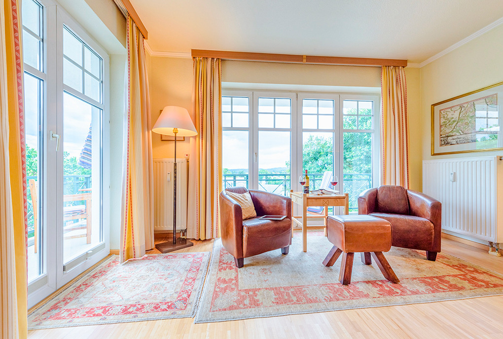 D 91.34 Wohnung 2 Pers.: Sehr helle und freundliche 2-Zimmerwohnung, 55 qm Wohnfläche, 2. Etage mit herrlichem Panorama-Blick über den Selliner See bis zum Jagdschloss Granitz. Geräumiger Wohn-/Essraum mit Couchgarnitur, Sat-TV, Esstisch. Gut ausgestattete Küche mit Backofen, Mikrowelle, Spülmaschine. Doppelzimmer. Bad/WC. Süd-West-Balkon mit Sitzmöbeln, Sonnenliege, Strandkorb.