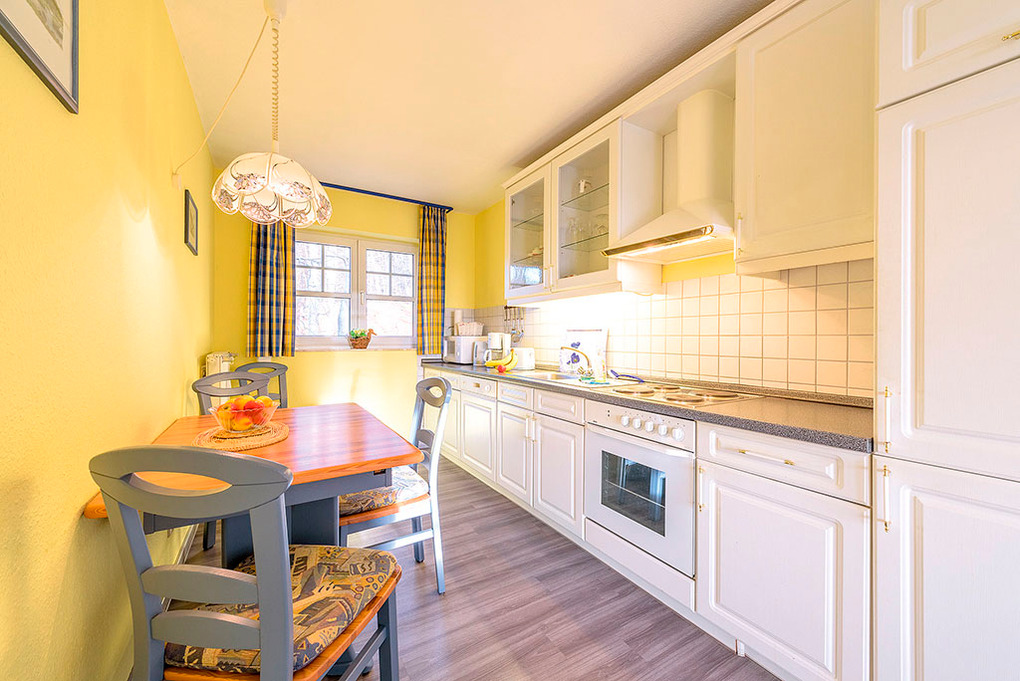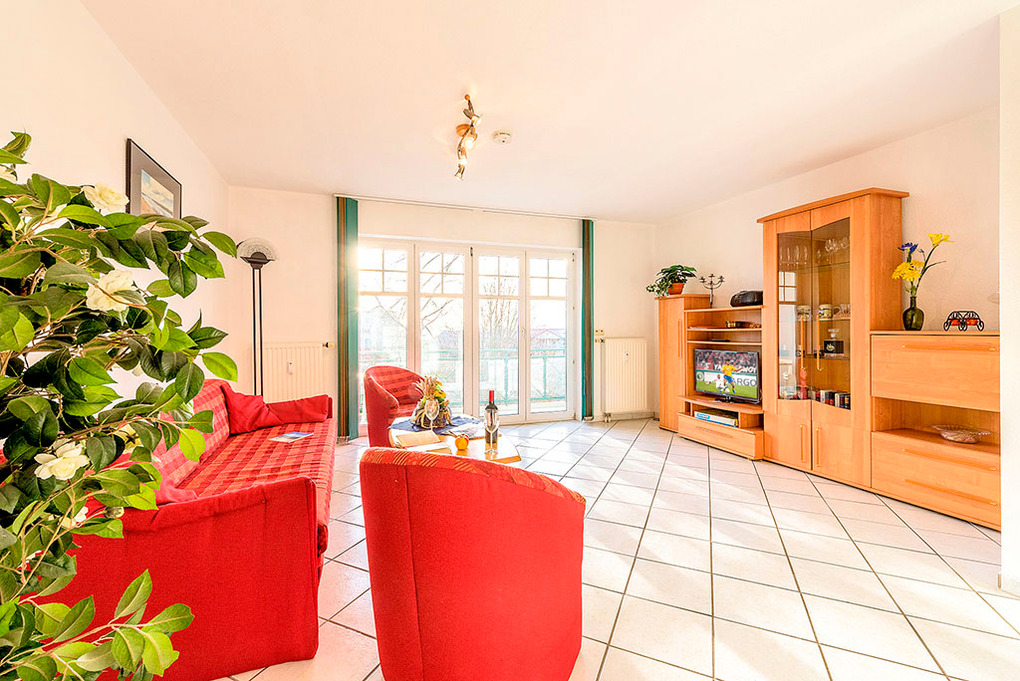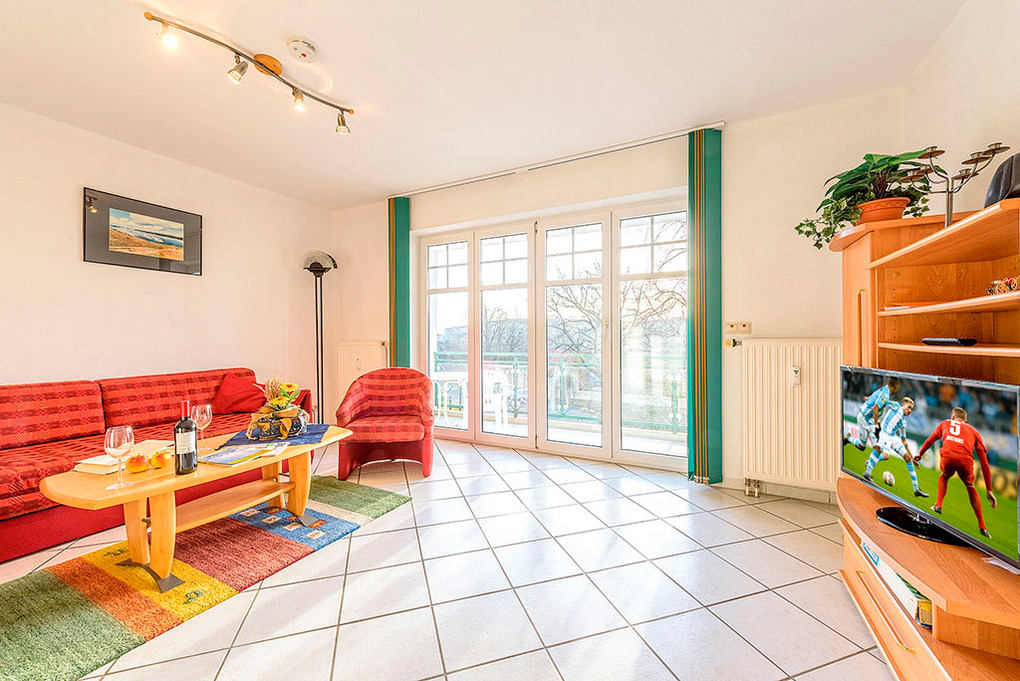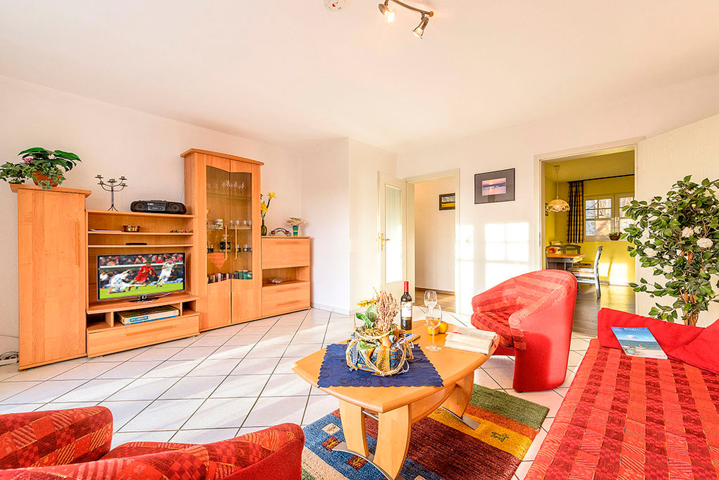 D 91.35 Wohnung 2-4 Pers.: Geschmackvoll eingerichtete 2-Zimmerwohnung, 60 qm Wohnfläche, 2. Etage. Wohn-/Essraum mit Couchgarnitur (Ausziehcouch 2 Pers.), Sat-TV, Esstisch, moderne Küchenzeile (Backofen, Mikrowelle, Spülmaschine). Doppelzimmer. Bad/WC. Überdachter Balkon mit Sitzmöbeln.