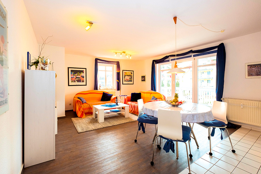 D 92.11A Wohnung 2-4 Pers.: 2-Zimmerwohnung mit 56 qm Wohnfläche, 1. Etage. Großer Wohn-/Essraum mit Sitzgarnitur (Ausziehcouch 2 Pers.), Flachbild-Sat-TV, Stereoanlage, Esstisch, moderner Einbauküche (Backofen, Mikrowelle, Spülmaschine). Doppelzimmer. Bad/WC. Sehr großer Balkon (30 qm) mit Sitzmöbeln.