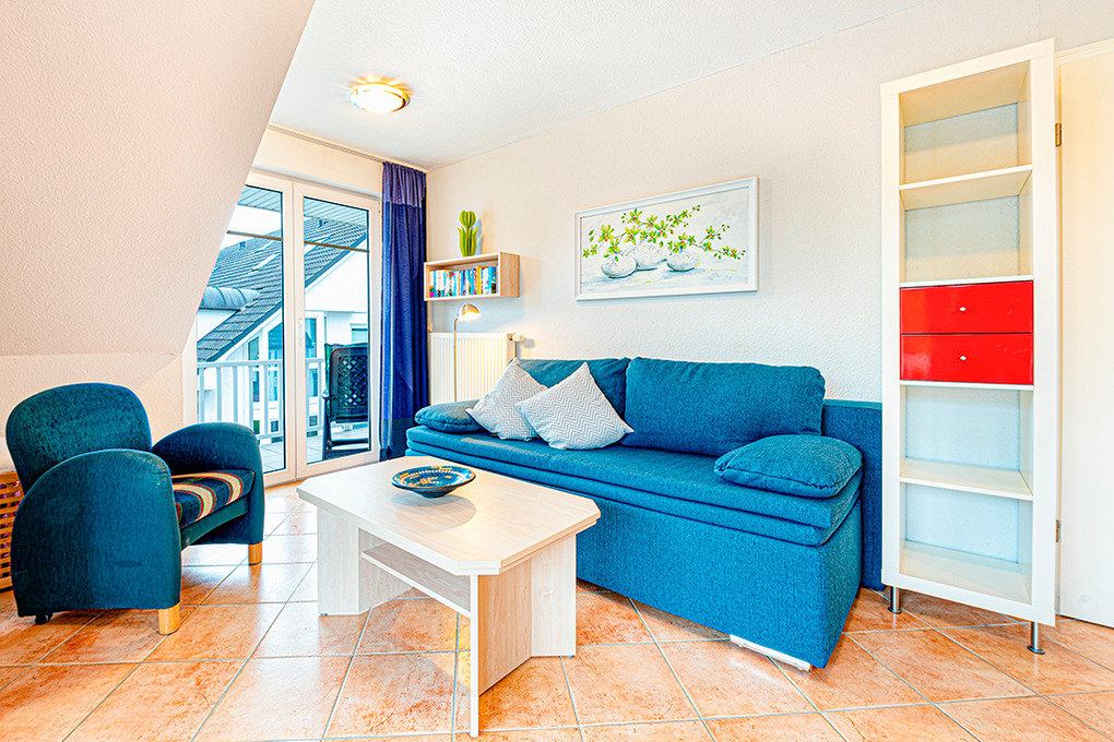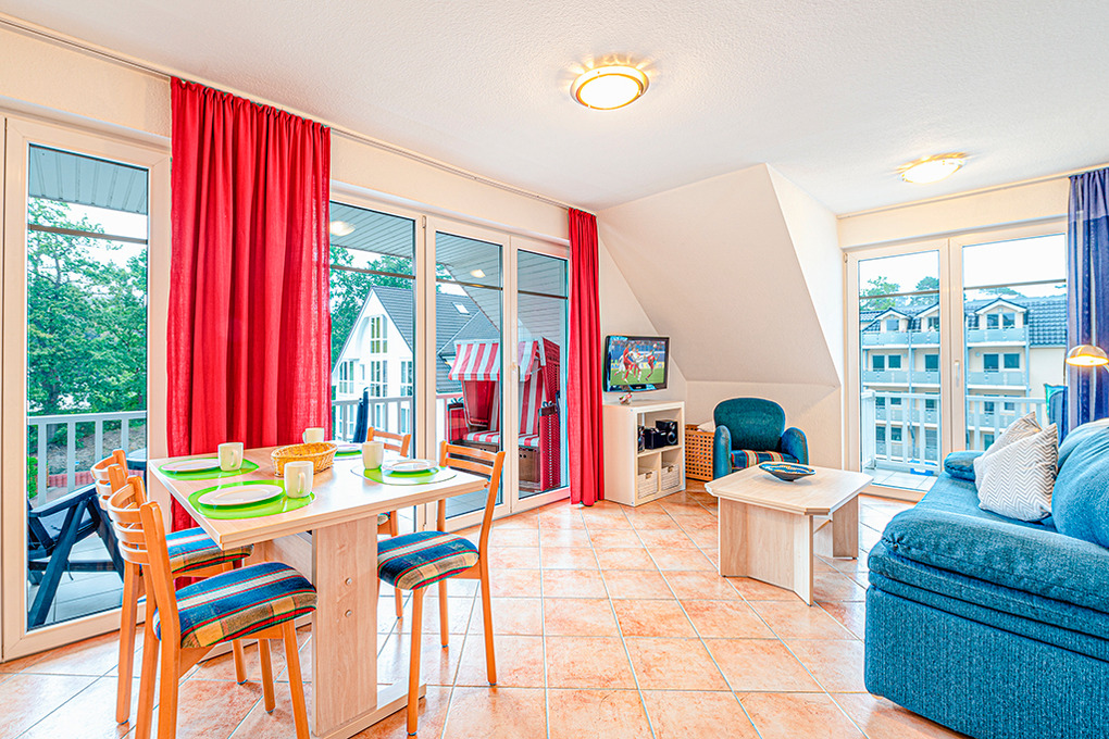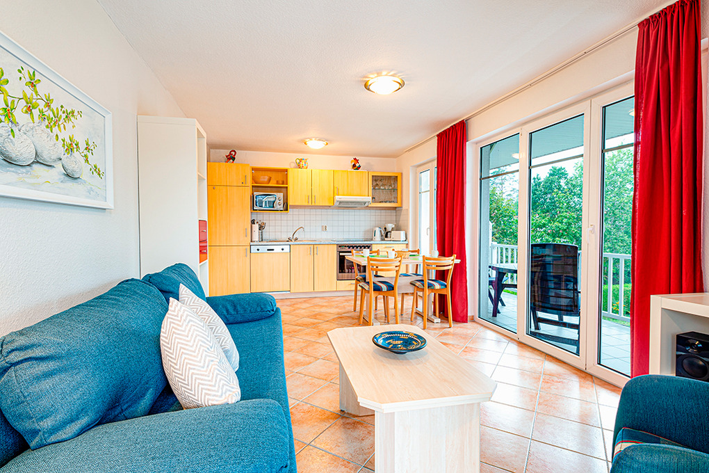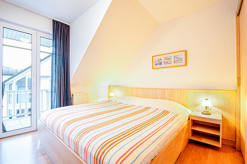 D 92.15A Wohnung 2 Pers.: Freundliche 2-Zimmerwohnung mit 51 qm Wohnfläche, 2. Etage Wohn-/Essraum mit Couchgarnitur, Sat-TV, Radio, Esstisch, Küchenzeile (Backofen, Mikrowelle, Spülmaschine). Doppelzimmer. Bad/WC. 2 Balkone mit Sitzmöbeln.