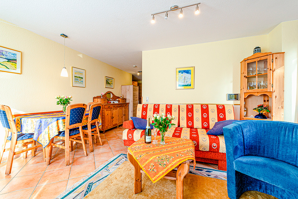 D 92.30A Wohnung 2-3 Pers.: 2-Zimmerwohnung, 40 qm Wohnfläche. Gemütlicher Wohn-/Essraum mit Couchgarnitur (Schlafcouch 1 Pers.), Esstisch, moderner Küchenzeile (Backofen, Mikrowelle, Spülmaschine). Doppelzimmer. Bad/WC. Balkon mit Sitzmöbeln.