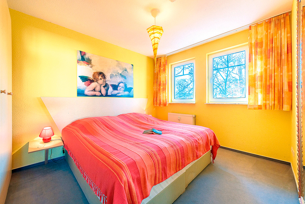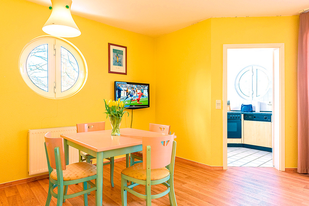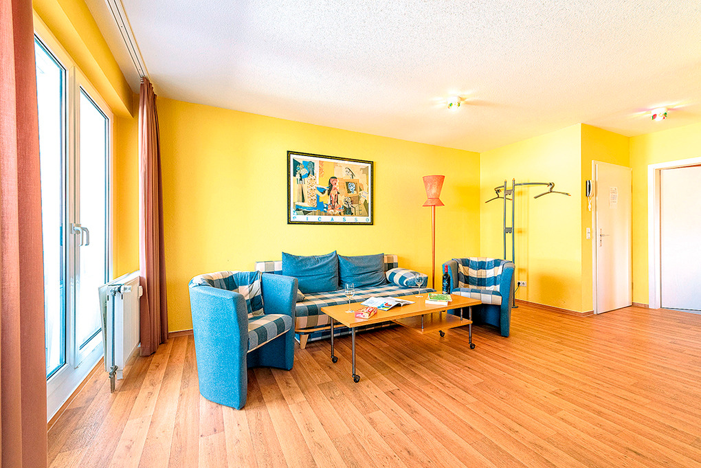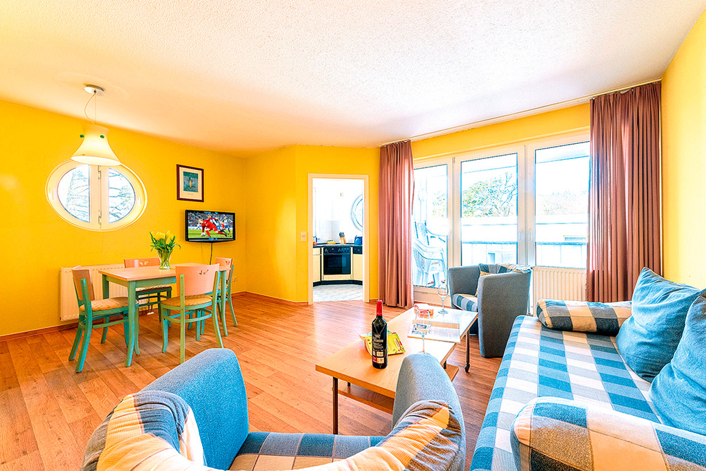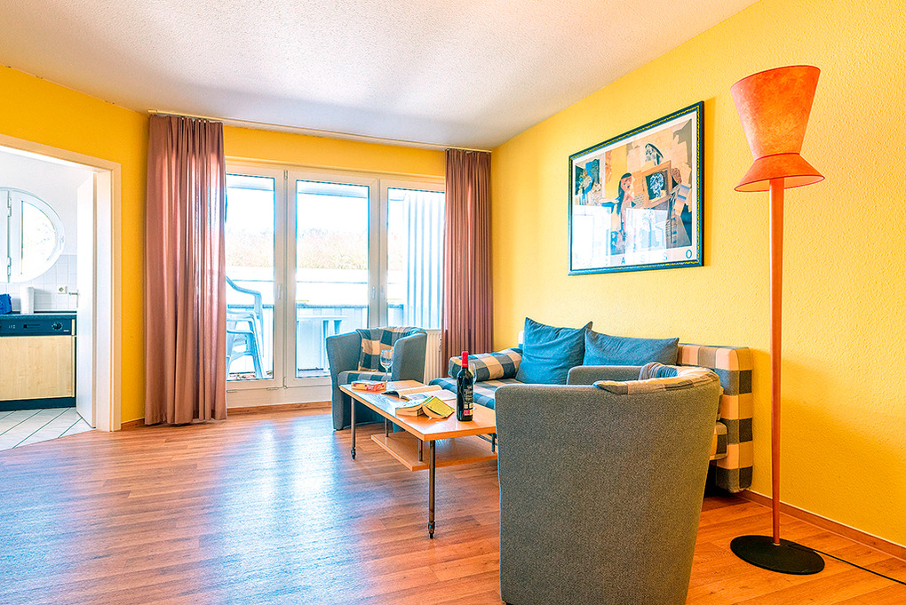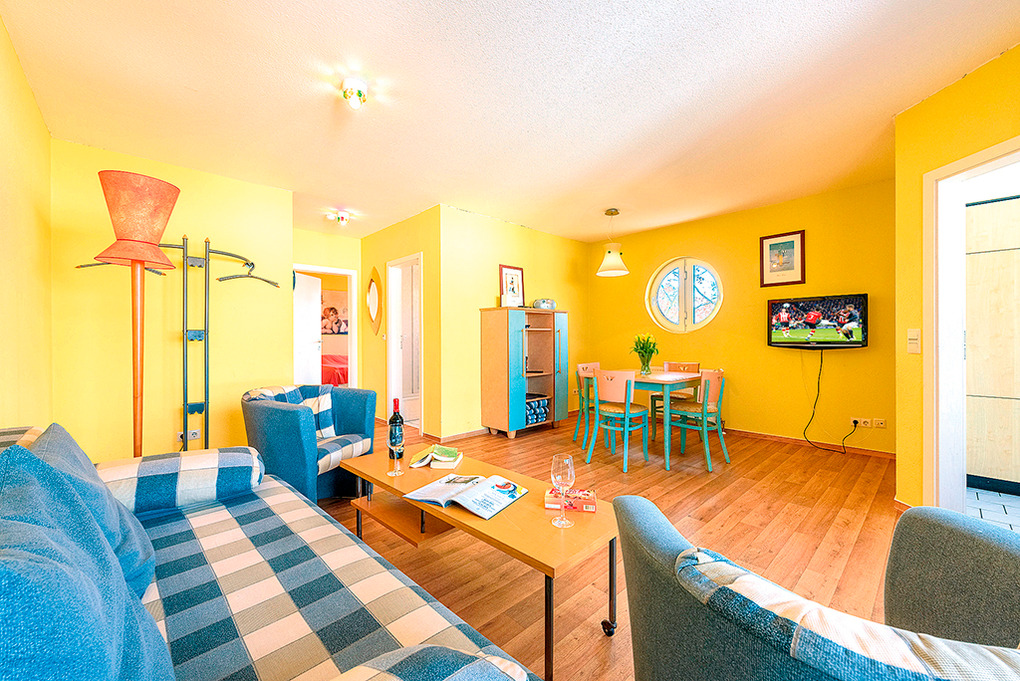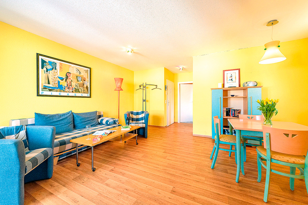 D 92.35M Wohnung 2-4 Pers.: 2 1/2-Zimmerwohnung, 60 qm Wohnfläche. 2. Etage. Helles Wohnzimmer mit Couchgarnitur (Schlafcouch 2 Pers.), Sat-TV, Radio, Esstisch. Küche mit moderner Küchenzeile (Backofen, Spülmaschine). Doppelzimmer. Bad/WC. Überdachter Balkon.
