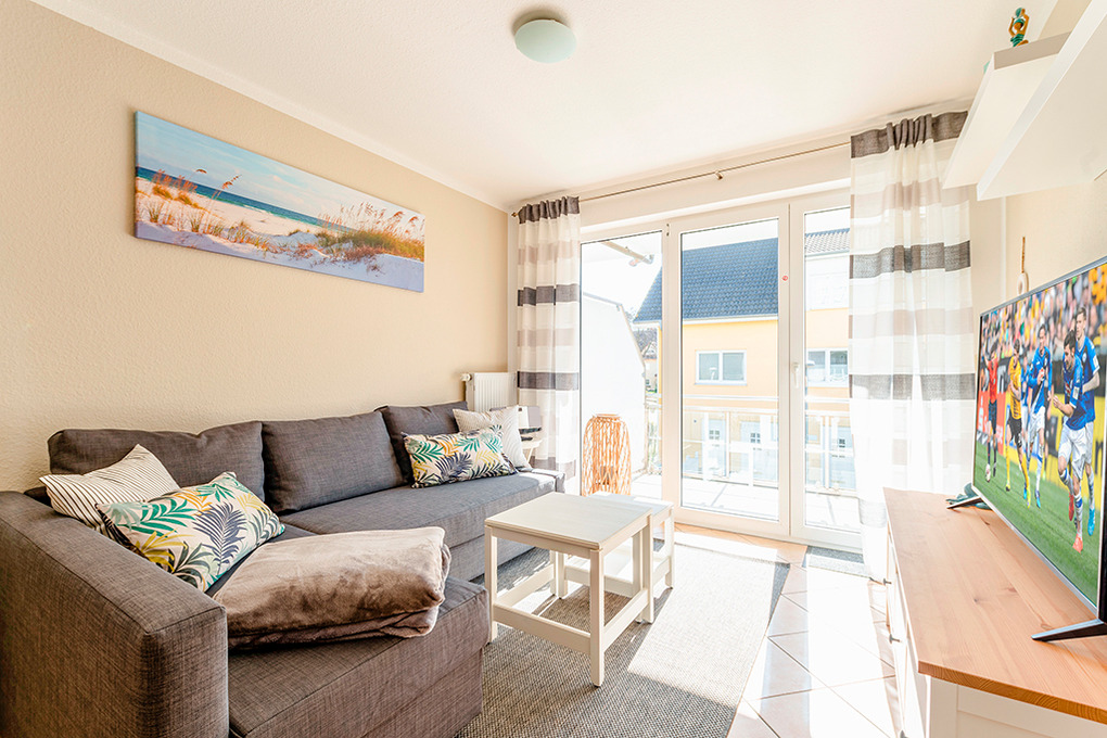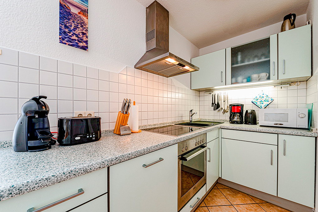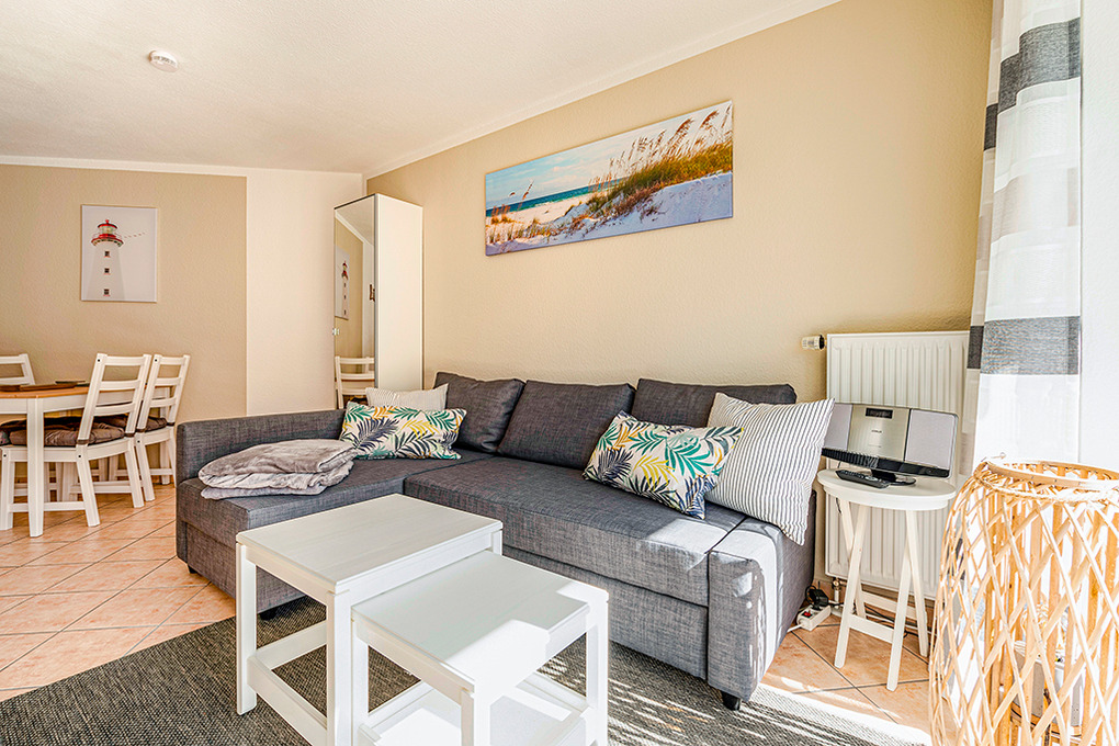 D 92.37 Wohnung 2-4 Pers.: Freundliche 2-Zimmerwohnung, 39 qm Wohnfläche, 1. Etage (Nichtraucherwohnung). Heller Wohn-/Essraum mit Couchgarnitur (Ausziehcouch 2 Pers.), Esstisch, Sat-TV, moderne Küchenzeile (Backofen, Mikrowelle, Spülmaschine). Doppelzimmer. Bad/WC. Balkon.