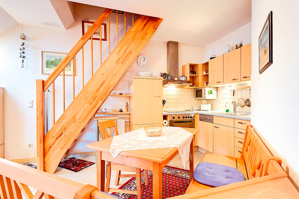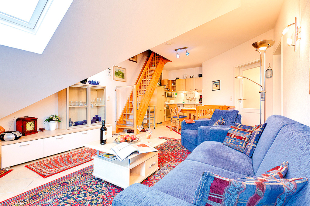 D 92.47 Wohnung 2 Pers.: 2-Zimmerwohnung, 51 qm Wohnfläche, 2. Etage. Heller Wohn-/Essraum (leichte Dachschrägen) mit gemütlicher Essecke, moderner Küchenzeile (Backofen, Mikrowelle, Spülmaschine). Doppelzimmer. Bad: Du, Wb, WC. Balkon.