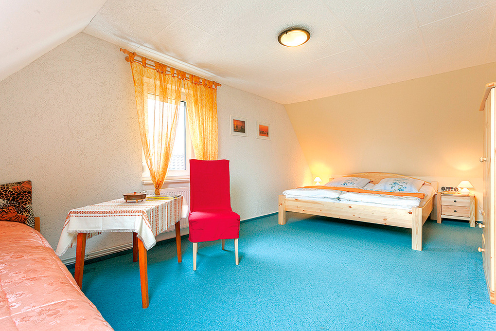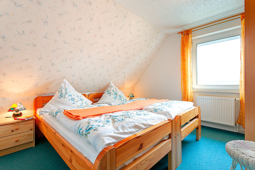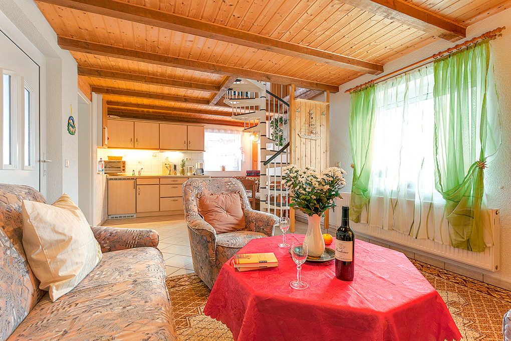 D 92.49 Ferienhaus 2-4 Pers.: 3-Zimmerhaus mit 75 qm Wohnfläche über 2 Etagen. Wohn-/Essraum mit Couchgarnitur, Sat-TV, Radio-CD, Küchenzeile (2 Pl. E-Herd, Mini-Backofen, Spülmaschine). Bad/WC. Vom Wohnraum Wendeltreppe in die 1. Etage: Zwei Doppelzimmer.
