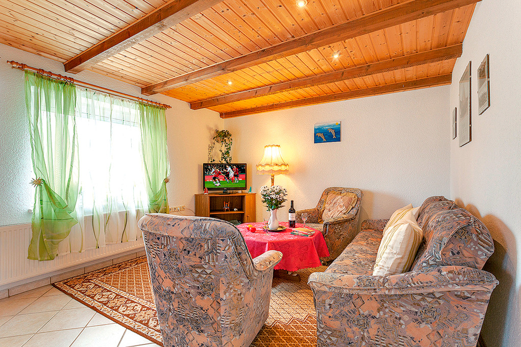 Haus: Gemütliches Ferienhaus auf einem abgeschlossenen Gartengrundstück. Freundliche Einrichtung. Zentralheizung. Nichtraucherhaus. Überdachte Terrasse mit Sitzmöbeln, Grill. Pkw-Stellplatz am Haus.
