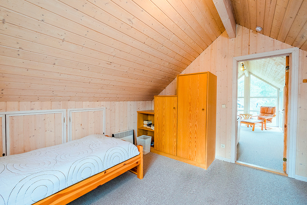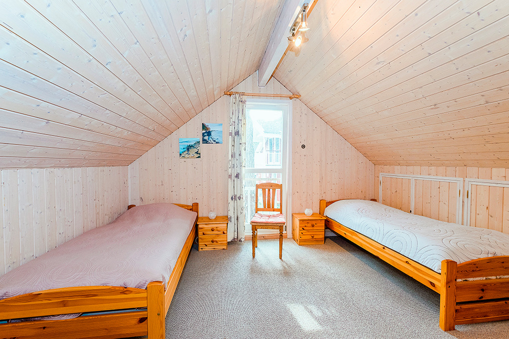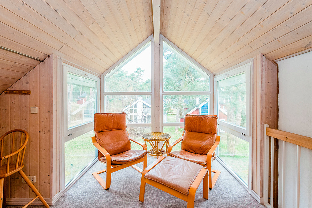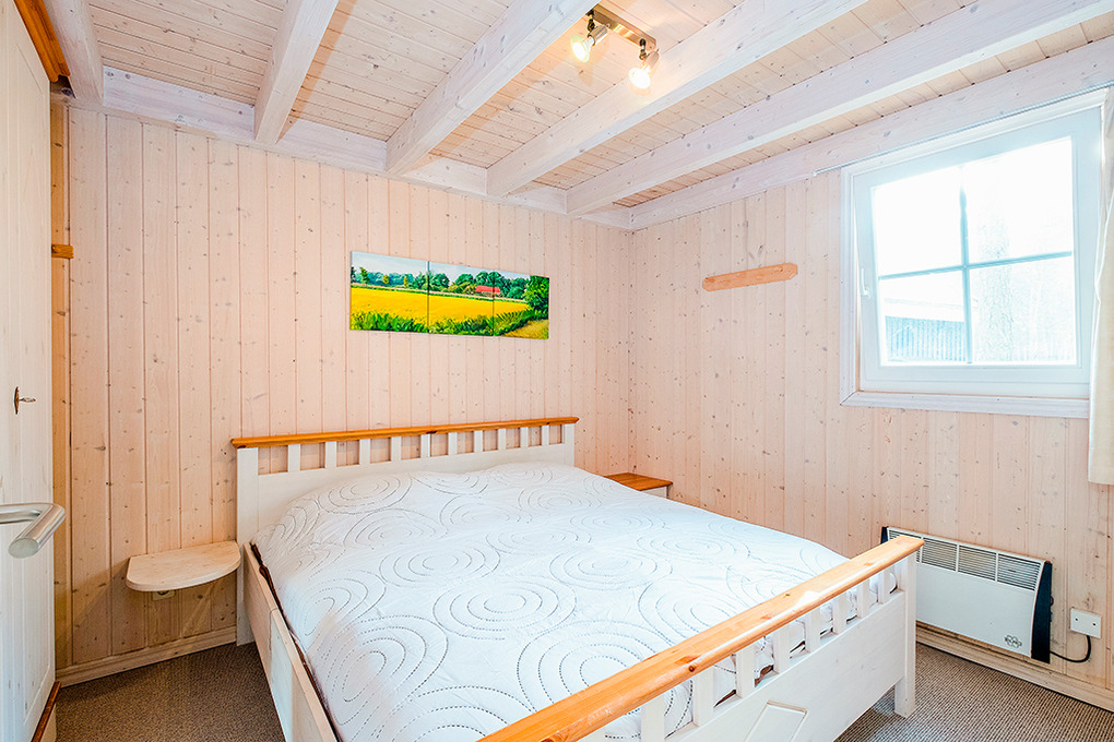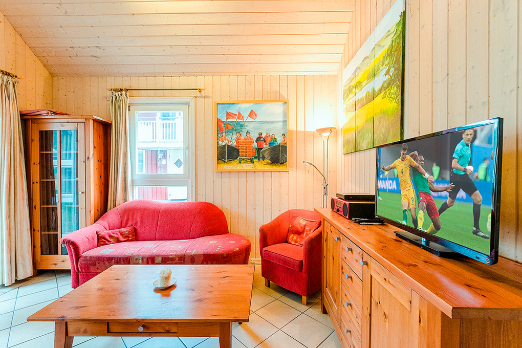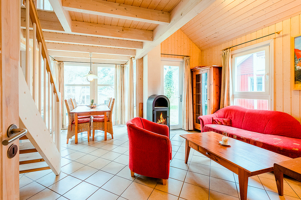 D 92.63A Ferienhaus 2-6 Pers.: Komfortables 3-Zimmerhaus, 85 qm Wohnfläche über 2 Etagen. Parterre: Heller, freundlicher Wohn-/Essraum mit Kaminofen, Sitzgruppe, Sat-TV, Radio/CD, Esstisch in verglastem Erker, moderner Küchenzeile (Backofen, Mikrowelle, Spülmaschine). Doppelzimmer. Bad: Sauna, Whirlpool, Du, Wb, WC, Waschmaschine. 1. Etage (leichte Dachschräge): Sitzecke in verglastem Erker. 2 Schlafplätze auf offener Galerie. 2-Bettzimmer.