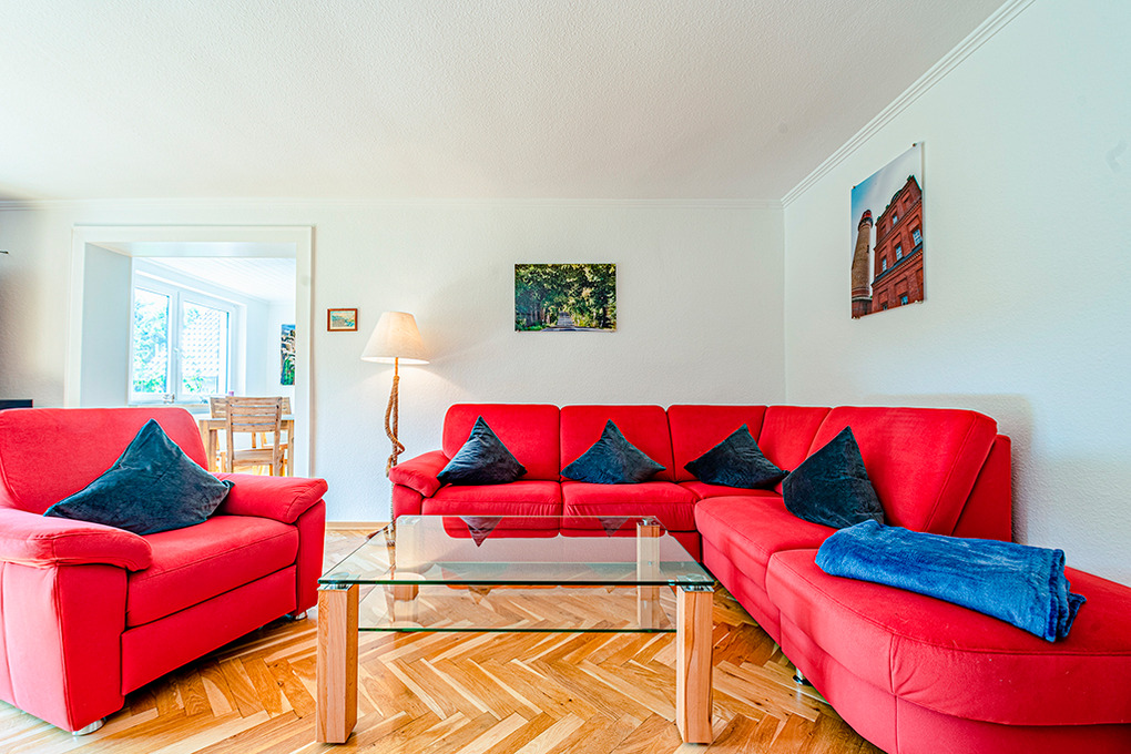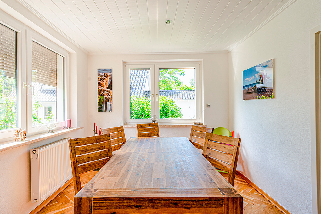 Haus: Großzügiges Ferienhaus auf einem 1000 qm großen Grundstück. Moderne, geschmackvolle Einrichtung. Kostenloser Internetzugang (W-Lan). Nichtraucherhaus. Separate Fewo für 2 Pers. (D 92.110) im Anbau mit eigenem Eingang. 2 Terrassen mit Sitzmöbeln. Gartenhaus mit Waschmaschine und Abstellmöglichkeiten für Fahrräder (gemeinschaftliche Nutzung). 2 Pkw-Stellplätze am Haus.