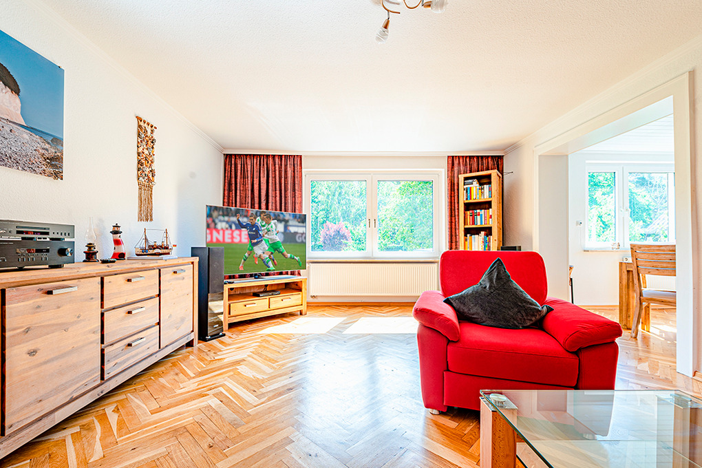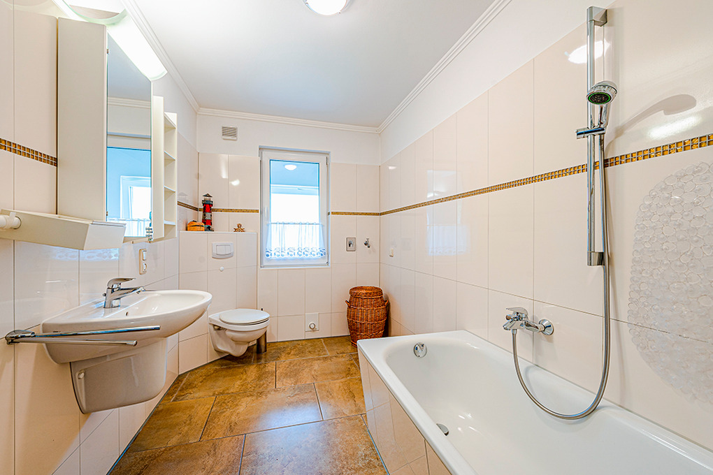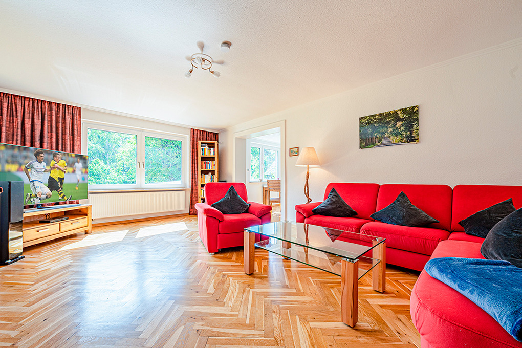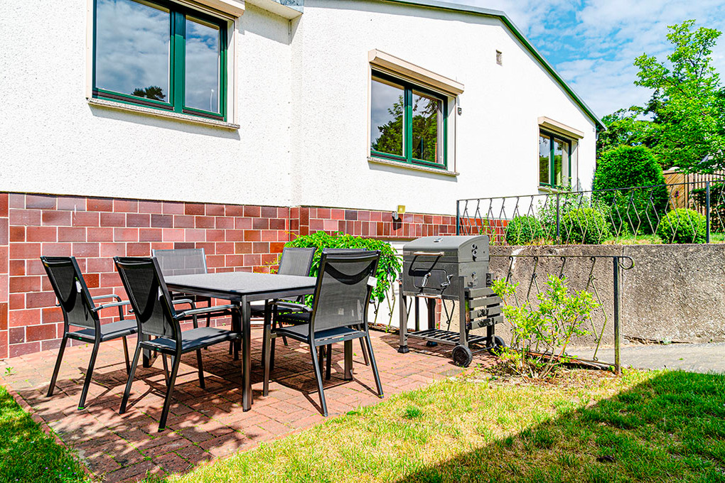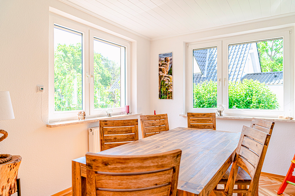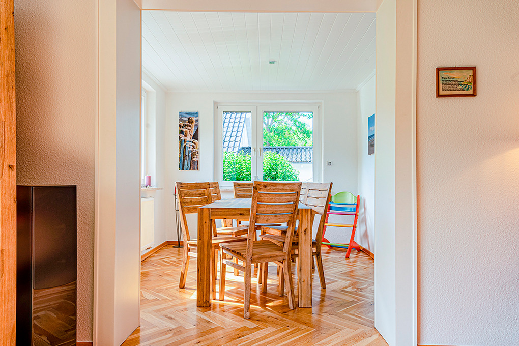 Haus: Großzügiges Ferienhaus auf einem 1000 qm großen Grundstück. 2 Wohneinheiten, die zusammen vermietet werden. Es ergibt sich ein großzügiges 5 1/2 Zimmerhaus mit 175 qm Wohnfläche zum Alleinbewohnen. Moderne, geschmackvolle Einrichtung. Kostenloser Internetzugang (W-Lan). Nichtraucherhaus. 2 Terrassen mit Sitzmöbeln. Gartenhaus mit Waschmaschine, Abstellmöglichkeiten für Fahrräder. 3 Pkw-Stellplätze am Haus.