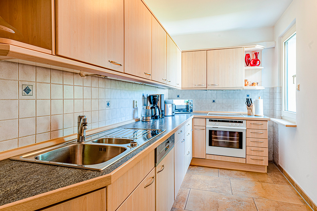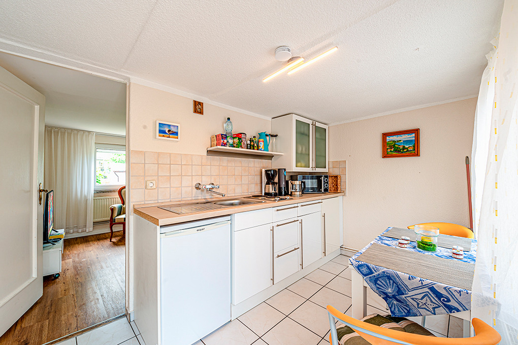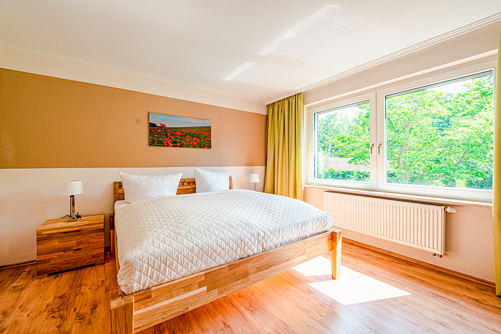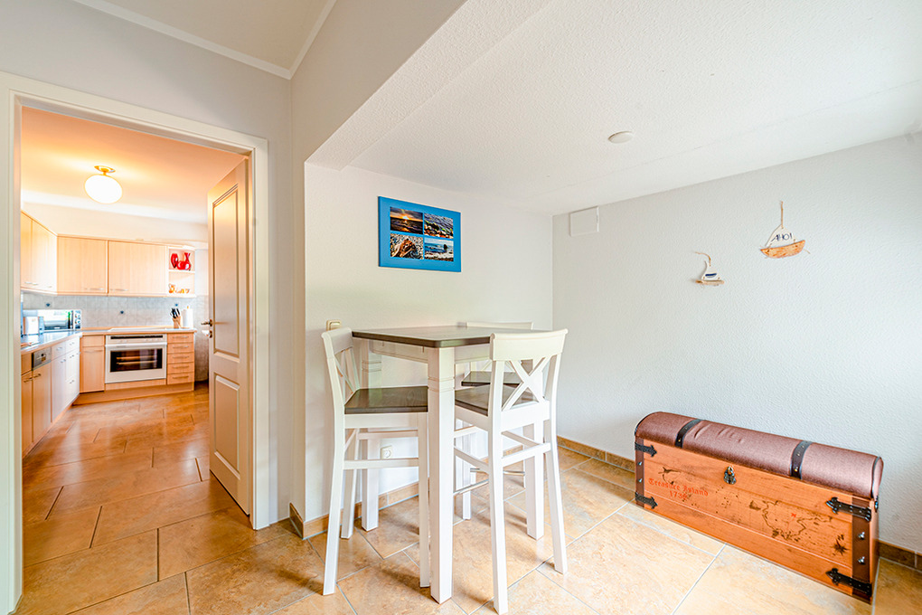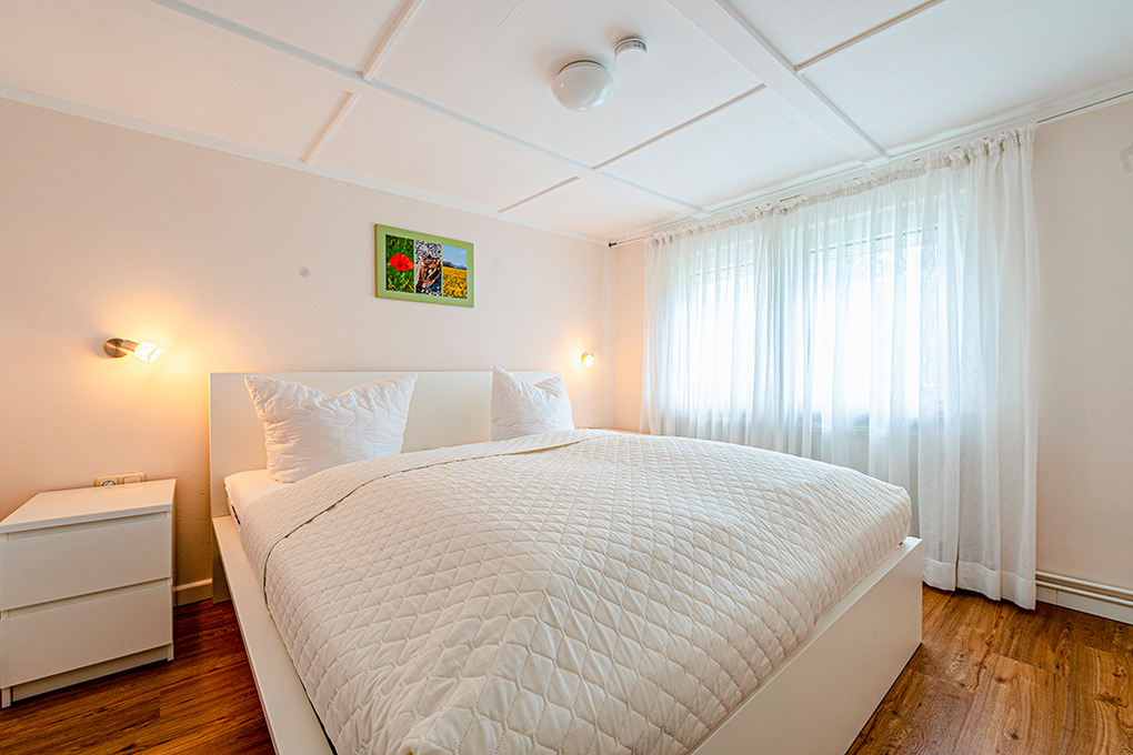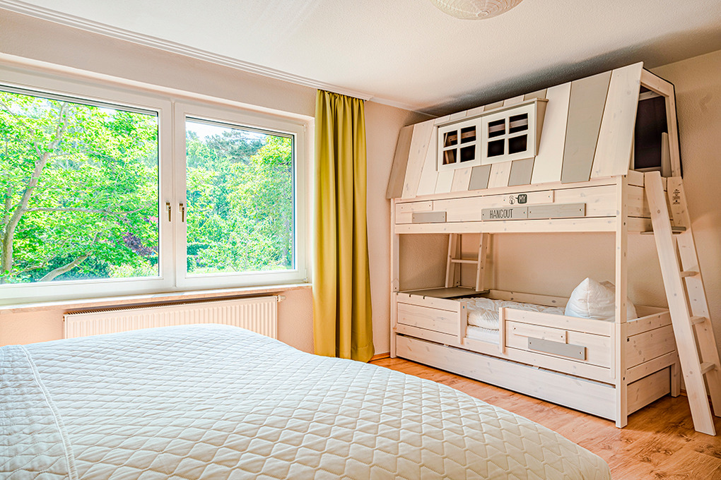 D 92.112 Ferienhaus 6 Erw., 2 Kinder: Sehr geräumiges 5 1/2-Zimmerhaus mit 175 qm Wohnfläche, Parterre. Wohn-/Essraum mit Couchgarnitur, Sat-TV, Radio-CD, Esstisch, gut ausgestatteter Einbauküche (Backofen, Mikrowelle, Spülmaschine). Doppelzimmer. 4-Bettzimmer mit Doppelbett, Abenteuerhochbett: Oberer Bereich Spielhöhle, darunter Einzelbett mit Ausziehbett für Kinder bis 14 Jahre. Bad: Bw/Du, Wb, WC. Separate Fewo für 2 Pers. im Parterre mit eigenem Eingang: Freundliche 2 1/2-Zimmerwohnung mit 45 qm Wohnfläche, Parterre. Wohnraum mit Sitzgarnitur, Sat-TV. Separate Küche mit Esstisch, 2 Pl. E-Herd, Mikrowelle. Doppelzimmer. Bad/WC.