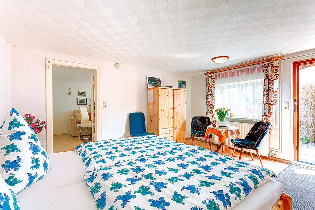 D 92.120 Wohnung 2 Pes.: Gemütliche 2-Zimmerwohnung mit 32 qm Wohnfläche, Parterre. Wohnraum mit Couch, Sat-TV, kleinem Esstisch, Küchenblock (2 Pl. Ceranfeld, Spülmaschine). Doppelzimmer. Bad/WC.