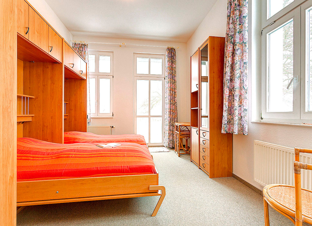 D 93.23 Wohnung 2-3 Pers: 2-Zimmerwohnung, 45 qm, 1. Etage. Wohn-/Schlafraum mit Couchgarnitur (Ausziehcouch 1 Pers.), Sat-TV, Esstisch, Küchenzeile (Backofen). Doppelzimmer mit Schrankbett (2 Pers.). Bad/WC. Überdachter Süd-Balkon, von beiden Zimmern zugänglich. Nord-Balkon teilweise mit Ostseeblick.