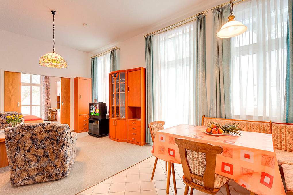 Haus: Im Stile der Bäderarchitektur restauriertes Appartementhaus mit kleinem Saunabereich. Kostenloser Internetzugang über W-Lan (nur D 93.23). Waschmaschine, Wäschetrockner in der Anlage. Zentralheizung. 1 PKW-Stellplatz pro Fewo.