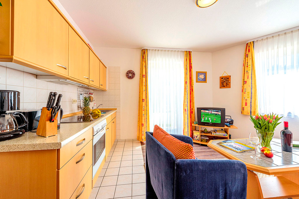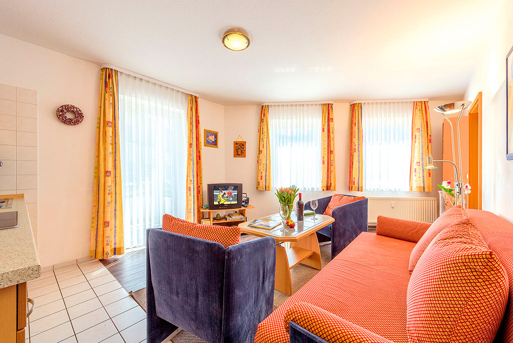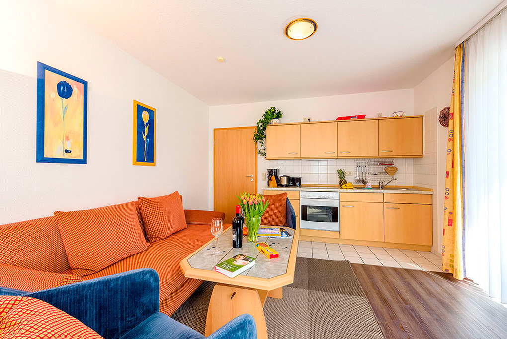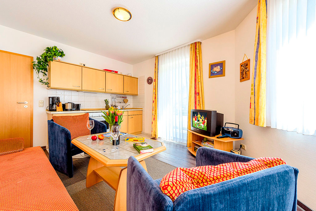 D 93.57 Wohnung 2-4 Pers.: Freundliche 2-Zimmerwohnung, 45 qm Wohnfläche, 1. Etage. Wohn-/Schlafraum mit Couchgarnitur (Ausziehcouch 2 Pers.), Esstisch, Küchenzeile mit Backofen. Doppelzimmer. Bad/WC. Balkon mit Sitzmöbeln.