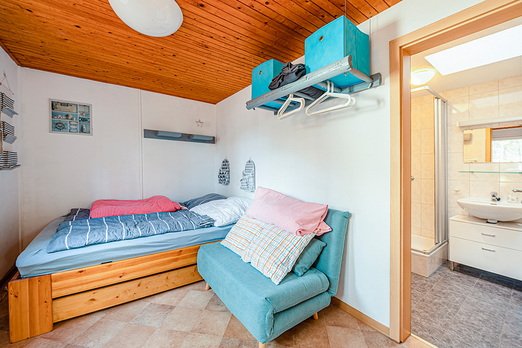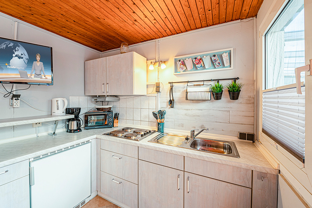 D 93.107 Bungalow 2 Pers.: 2-Zimmer-Haushälfte mit 25 qm Wohnfläche. Gemütliche Wohnküche mit Essecke, Sat-TV. Küchenzeile (4 Pl. E-Herd, Mikrowelle). Doppelzimmer mit französischem Doppelbett (1,60 m x 2 m). Kleines Bad mit Dusche, WC.